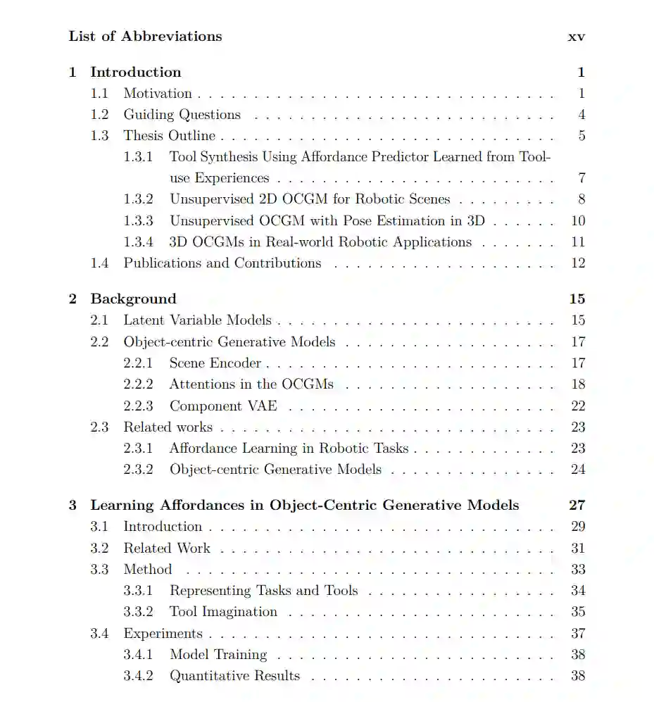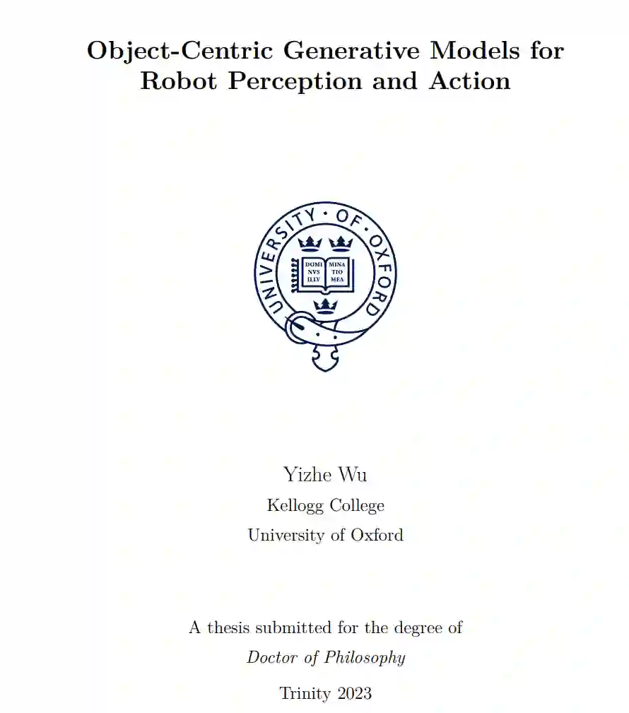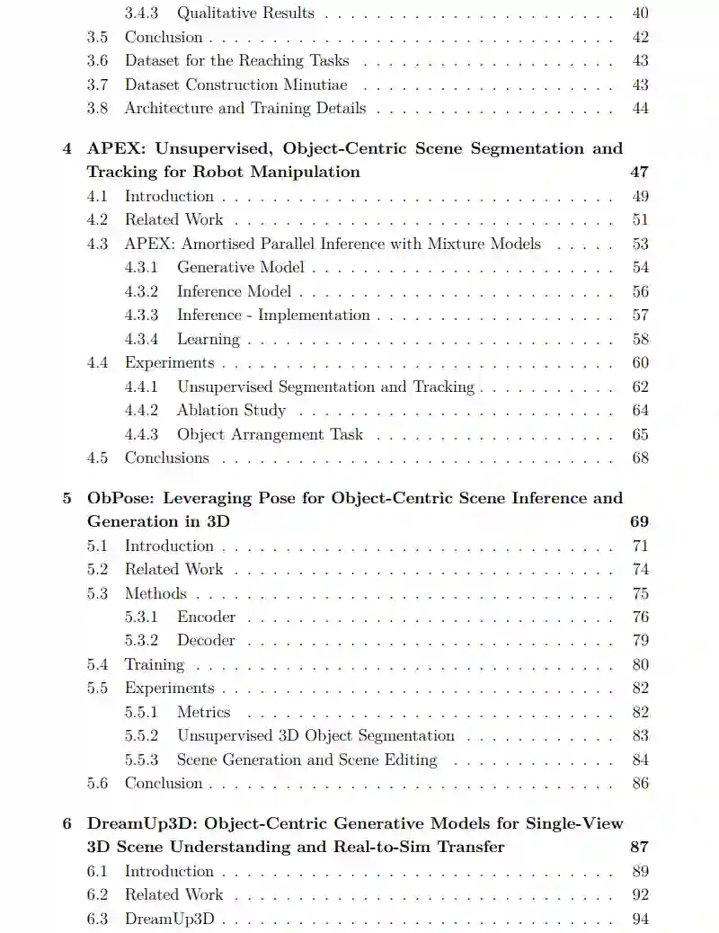 机器人操控系统涉及一个包括在环境中感知对象和在3D空间中规划行动的流程。深度学习方法被用于将场景分割成对象的组成部分,然后学习以对象为中心的特征以预测下游任务的行动。尽管在几项操控任务中取得了有希望的表现,监督方法缺乏与对象的一般属性相关的归纳偏差。最近的进展显示,通过以对象为中心的方式编码和重构场景,模型可以在没有人类监督的情况下从原始数据中发现类对象实体。此外,通过重构发现的对象,模型可以学习一个变分潜空间,捕获对象的各种形状和纹理,通过选择的先验分布进行规范化。在本论文中,我们探究了这一学习到的以对象为中心的潜空间的属性,并开发了可以应用于现实世界机器人场景的新颖以对象为中心的生成模型(OCGMs)。 在本论文的第一部分,我们研究了一个利用学习到的潜空间来优化应用于到达任务的一系列工具的工具合成任务。给定一个展示场景中障碍物和到达目标的图像,训练一个可供性预测器来预测给定任务的工具的可行性。为了模仿人类使用工具的经验,可行性标签是通过模拟到达任务的试错过程获得的。我们发现,通过采用激活最大化步骤,模型可以为给定任务合成适当的工具,准确率高。此外,工具合成过程表明,在学习到的潜空间中存在一个与任务相关的轨迹,可以通过训练有素的可供性预测器找到。 本论文的第二部分聚焦于开发新颖的OCGMs及其在机器人任务中的应用。我们首先介绍一个部署到机器人操控数据集中的2D OCGM,在模拟和现实世界场景中均有应用。尽管机器人臂和对象之间存在密集的交互,我们发现模型在没有任何人类监督的情况下从原始观测中发现有意义的对象实体。接下来,我们将2D OCGM升级到3D,通过利用NeRFs作为解码器来显式建模对象和背景的3D几何形状。为了从其外观信息中分离对象的空间信息,我们提出了一种用于对象的无监督6D姿态估计的最小体积原则。考虑到场景中的遮挡,我们通过引入一个形状补全模块来想象姿态估计步骤之前未观察到的对象部分,进一步改进姿态估计。最终,我们成功地将模型应用于现实世界的机器人场景,并在包括3D重建、以对象为中心的潜在表示学习、对象重排的6D姿态估计等几项任务上,与几个基线进行了性能比较。我们发现,尽管是一种无监督方法,我们的模型在一系列不同的现实世界任务中都取得了改进的性能。