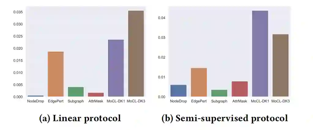 图3显示了在linear protocol下所有数据集的不同增强组合的结果。每个单元格表示从头训练的GNN与用不同的增强组合方法训练的模型在linear protocol下的性能提升。蓝色代表负值,红色代表正值。MoCL-DK得到的表示加上线性分类器产生的预测准确率与GNN效果(bace、bbbp、sider)相当,甚至比它更好(clintox,mutag)。可以看到包含MoCL-DK的行和列的值通常更高,因此MoCL-DK与其它增强方法相结合几乎总是能产生更好的结果。属性掩蔽和MoCL-DK一般在所有场景中都有效,将它们结合起来通常会有更好的性能。这验证了作者之前的假设,即MoCL-DK和属性掩蔽不违反生物学假设,因此比其它增强效果更好。
