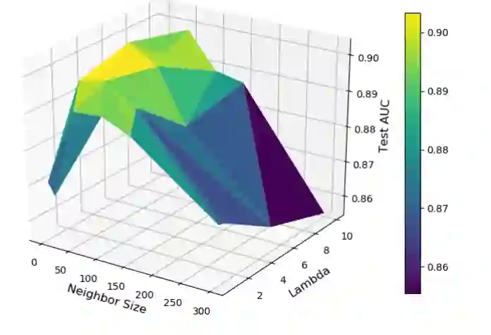 图5 加入全局领域知识后不同增强方法的性能提升 3.3 敏感度分析 图6显示了所提出的方法在不同超参数组合下的性能曲面。可以看到,对于全局损失,使用相对较小的邻域大小(不是太小)和较大的权重(不是太大)可以获得最佳结果。