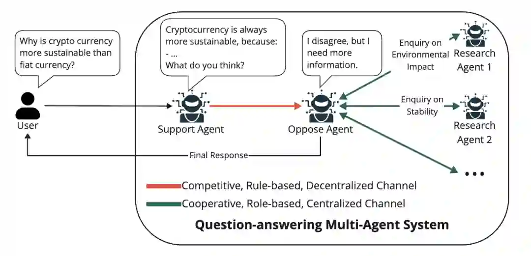 另一类代表性做法是多专家问答与答案融合。此时,多个主体不必都生成完整答案,而是分别提供局部能力,例如事实判断、技能补充、候选排序与结果融合[42,43]。其关键并不只是“多答案投票”,而在于系统将答案生成、答案比较与答案合成拆分为不同阶段。由此,模型无需在一次前向过程中同时完成检索、判断、表达与选择,而可以将这些工作分散给多个局部角色完成。