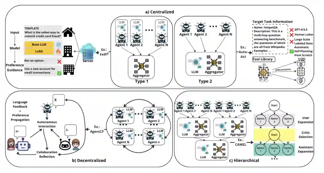 图2:多智能体协作形式 除了关系层之外,还需要考察协议层,即主体之间究竟按照何种原则展开互动。规则驱动协议是最容易理解的一类,其基本特征是系统预先规定发言顺序、转交流程、终止条件以及消息格式[28,29]。此类方法具有稳定、可复现、便于调试等优点,尤其适用于流程明确的任务,但其灵活性相对不足。角色驱动协议则不对每一步进行细粒度写死,而是通过岗位职责对系统进行约束,只要各主体守住职责边界,整体流程即可运转[13,18,19]。模型驱动协议则进一步将部分协调权交还给模型本身,使系统能够依据输入动态决定如何组织协作、何时调用其他角色以及何时重排任务。这类方法更为灵活,但评估与调试难度也相应更高[30-33]。 进一步而言,结构层关注的是信息在多个主体之间的流动方式。集中式结构由中心调度者负责任务接收、角色调用与结果汇总,这种结构实现相对简洁,也更适合工程化部署[19,34];但其问题在于中心节点容易成为系统瓶颈,并可能将局部偏差扩散为全局偏差。分布式结构则允许主体之间直接协商,不依赖唯一总控者,此类结构更加灵活且具有更强鲁棒性,但同时更容易引发通信冗余与状态不一致[17,35]。层级结构介于两者之间,由高层角色负责规划与资源分配,中层负责协调,底层负责执行,因此在长流程、多依赖任务中更为自然[18,19]。