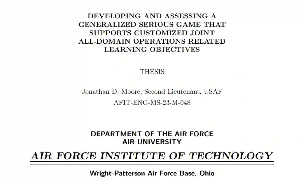 过去几十年来,随着近邻对手的崛起,美国国防部(DoD)越来越重视联合全域作战(JADO)。对 JADO 的重视突出了对实践演习和培训的需求,这些演习和培训可以用来吸引各级军事人员的参与,帮助他们了解自己在联合部队中的重要作用。此外,由于战争所涉及的技术和领域经常演变,这些教学工具必须具有适应性。严肃游戏《下一个作战空间》(BSN)旨在通过在战略纸牌游戏中模拟真实世界的军事资产,教授高级联合全域作战(JADO)/多域作战(MDO)概念。先前的研究表明,BSN 是教授 JADO 基本概念的有效方法;然而,BSN 是围绕一套固定的学习目标 (LO) 设计的,这使其无法适应许多 JADO 培训需求。例如,第 333 网络训练中队和空军研究实验室(AFRL)表示希望在训练中加入 JADO 游戏,但 BSN 的学习目标并不能代表他们的目标。此外,作为本论文的一部分,在高级网络教育(ACE)课程中对学员进行的试点研究发现了 BSN 的不足之处以及定制 BSN 的好处。为了跟上不断发展的战争形势并满足国防部各部门的需求,本研究引入了 “下一代作战空间教育框架”(BSNEF)。BSNEF 允许 JADO 教员根据其独特的 LO 创建自己版本的 BSN。开发该框架和辅助网络应用程序的目的是为教员提供一个灵活而有吸引力的教学开发工具,以设计能有效教授 JADO 概念的游戏。通过对 JADO 教师和严肃游戏主题专家 (SME) 的调查,对该框架进行了评估。此外,还对一项案例研究进行了分析,以确定该框架可代表的概念范围。为了支持 BSNEF,开发了 BSN Game Creator BSN Game Creator (BSNGC) 网络应用程序,以帮助设计者验证和快速制作 BSN 变体的原型。调查反馈、案例研究和 BSNGC 的性能评估表明,BSNEF 可以大大减少创建定制 JADO 游戏所需的时间。这项研究的结果虽然没有得出结论,但表明,使用 BSNEF 将严肃游戏整合到 JADO 培训中,对于扩大教员可用的实践工具非常有用。