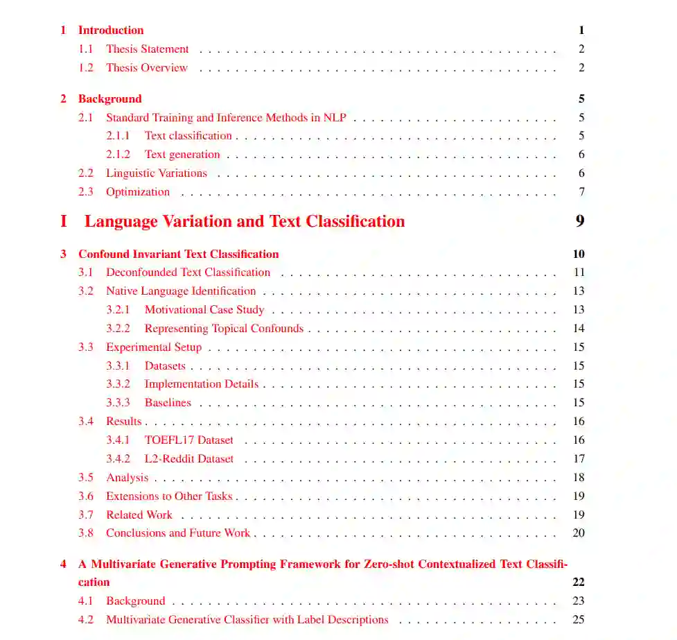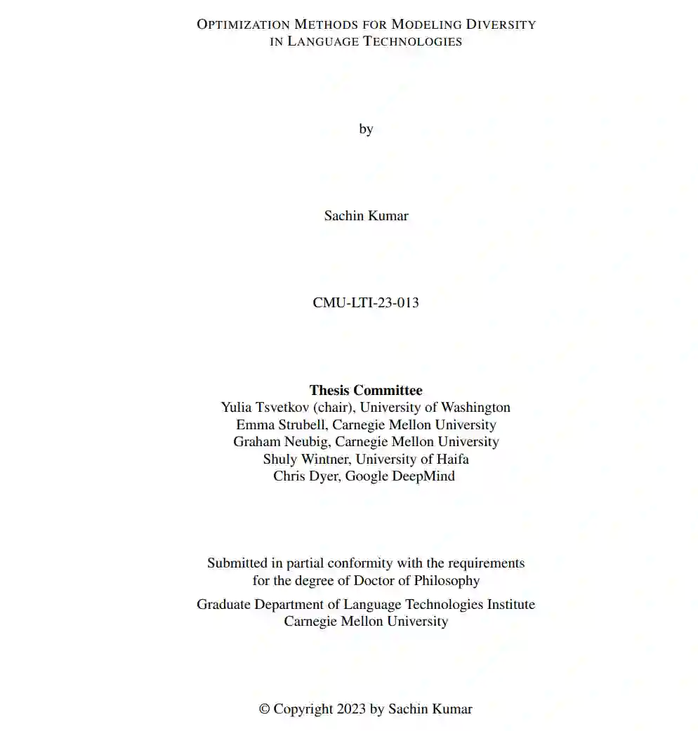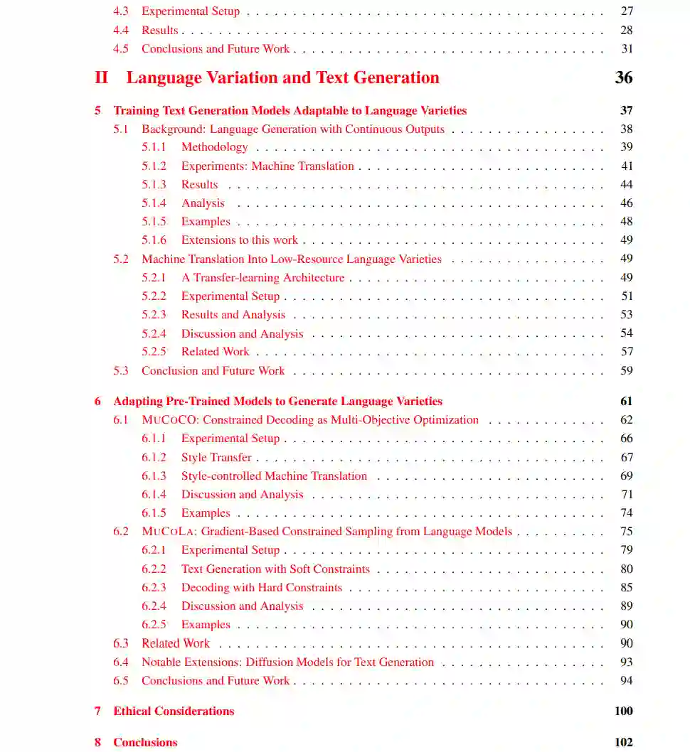 为了实现这一目标,这篇论文专注于重新思考语言理解和生成的标准训练和推理方法的机器学习解决方案。统一的主题是将文本中不同粒度的语言和额外语言多样性整合到ML模型中:从词汇(Kumar和Tsvetkov,2019;Bhat et al.,2019;Kumar et al.,2021a),到句法和风格(Jegadeesan et al.,2021;Kumar et al.,2021b,2022b;Han et al.,2023a),再到语义和语用(Kumar et al.,2023b)。1 我认为,与优化模型参数和输出以达到单一目标(例如最大化任务准确性或生成输入句子的忠实翻译)的传统算法不同,表征NLP中的变异本质上是多目标的。例如,最大化任务准确性和跨说话者变体的公平性;生成忠实翻译并控制特定风格,以及控制语言结构的简单性(或复杂性)。此外,为了促进在广泛实际环境中的使用,这篇论文旨在开发高效解决方案;从计算复杂性,到参数数量,到标记资源的数量。