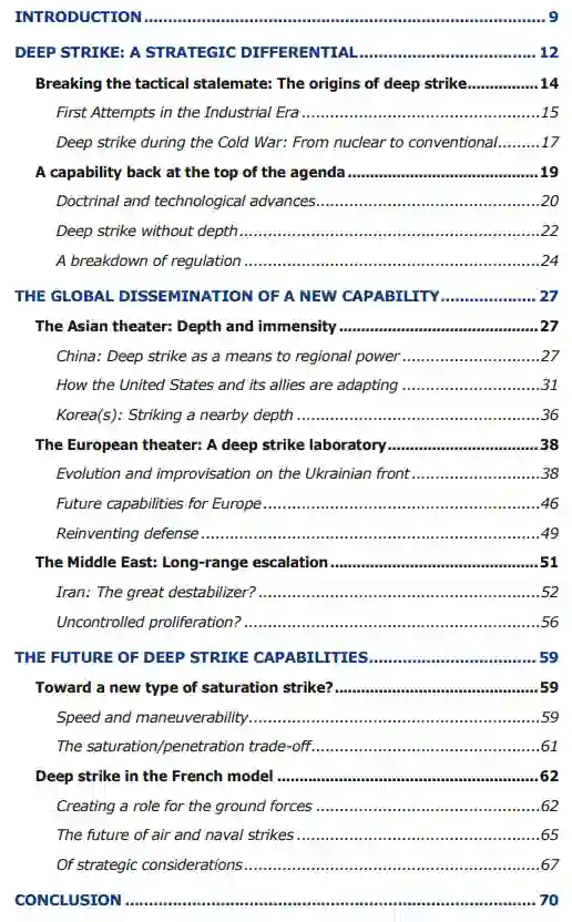 深度打击概念始于第一次世界大战突破前线僵局的需求,随着远程轰炸机及后续火箭与远程导弹的发展,于20世纪逐步成熟并多样化。1960年代后虽与核威慑紧密关联,但仍保持重要常规维度。冷战的终结与高强度对等冲突前景的消失,导致此类能力使用减少——缺乏可确定打击纵深的前线。美军全球快速打击能力的系列展示,使该议题上升至全球层面。