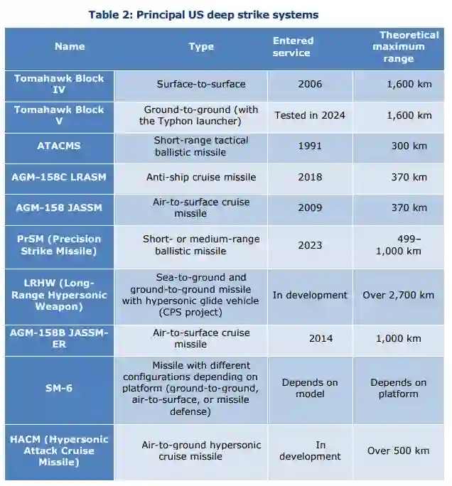 技术演进持续加速,各国着力提升打击系统的速度、精度与隐身性能。其他战区也涌现大型深度打击武库:大国正发展区域拒止能力,包括可威胁驻日、菲美军基地的超远程投射系统;作为回应,美国及其盟友(如韩国)加速部署战区级威胁武器;伊朗及其代理人将远程打击能力作为针对以色列及潜在地区竞争者的战略支柱。