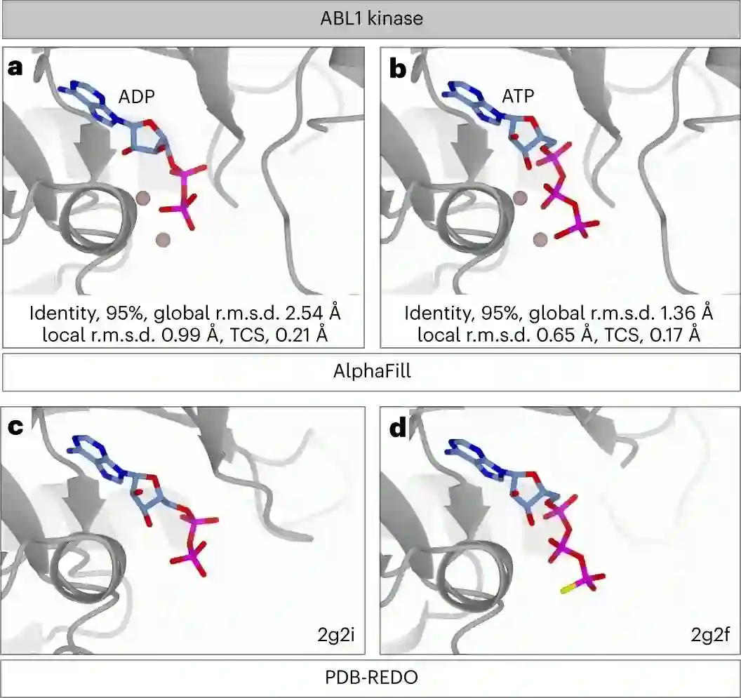 众所周知,激酶有多种状态,一种是提供有利于磷转移反应的环境的活性构象,另一种是不满足催化活性所需的化学限制的非活性状态。**到目前为止,AlphaFold只为每个蛋白质提供一种构象。**AlphaFold模型所对应的状态,事先是不知道的。 然而,AlphaFill可以将ADP和ATP(或其类似物)转移到AlphaFold模型中,只要PDB-REDO数据库中有相关的实验结构,不管特定残基的构象所描述的激酶的功能状态如何。