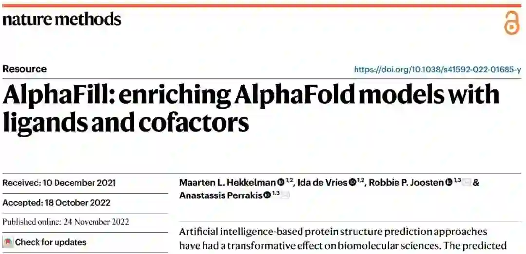 参考资料 Hekkelman, M.L., de Vries, I., Joosten, R.P. et al. AlphaFill: enriching AlphaFold models with ligands and cofactors. Nat Methods (2022). https://doi.org/10.1038/s41592-022-01685-y