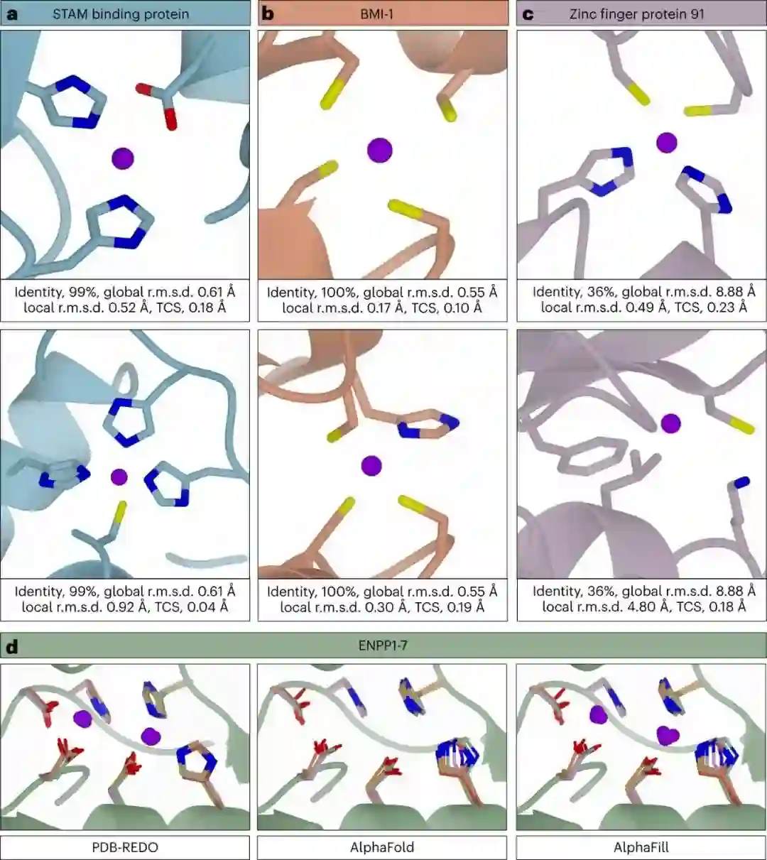 a, STAM结合蛋白中的一个催化型(顶部)和一个结构型(底部)锌离子。b, 人类BMI-1中的两个结构性锌离子。c, 锌指蛋白91中转移到结构性锌结合位点的锌离子(上),同一蛋白中错误放置的锌离子(下)。d, 在PDB-REDO模型中发现的ENPP1-7的双金属锌结合位点,与AlphaFold的人类ENPP1-7模型和AlphaFill中的相同结合位点相比,含有两个锌离子。 在外核苷酸焦磷酸酶/磷酸二酯酶(ENPP)家族的蛋白质中,双金属锌位点对催化作用非常重要。ENPP1-7的PDB-REDO模型的催化域的结构排列(图4d)显示,锌原子和协调它们的残基在所有家族成员中占据了高度相似的位置。相同蛋白质的AlphaFold预测(ENPP1-7的AF-P22413、AF-Q13822、AF-O14638、AF-Q9Y6X5、AF-Q9UJA9、AF-Q6UWR7、AF-Q6UWV6,分别)显示出更多的分歧,特别是组氨酸R5(图4d)。AlphaFill捕捉到AlphaFold和PDB-REDO模型之间的相似性,将这两个锌离子移植到ENPPs的蛋白质模型中(图4d)。组氨酸R5在AlphaFold预测中具有不同的旋转体,根据实验结构,它应该是一个单一的旋转体,这表明AlphaFill模型中的双金属锌位点可以从额外的细化中受益。