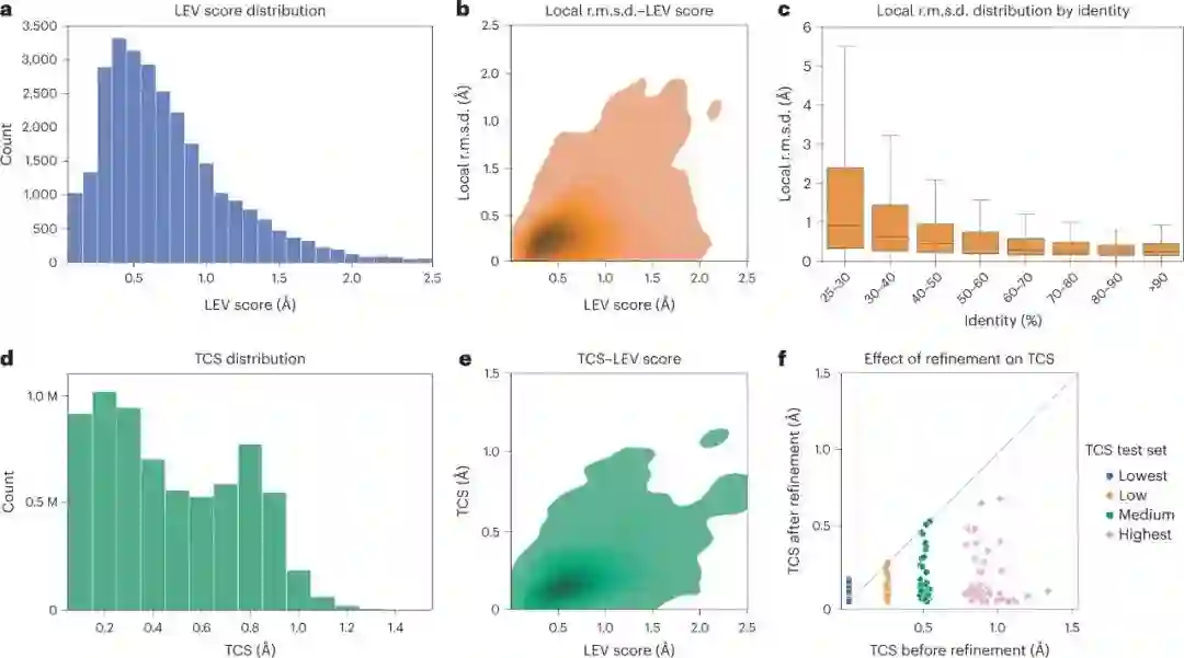然后,验证结果被用来得出质量指标,以注释AlphaFill数据库中的移植。由于本地r.m.s.d.与LEV评分有很好的相关性(图1b),作者进一步分析了它作为序列身份的函数的分布(图1c)来注释移植。
