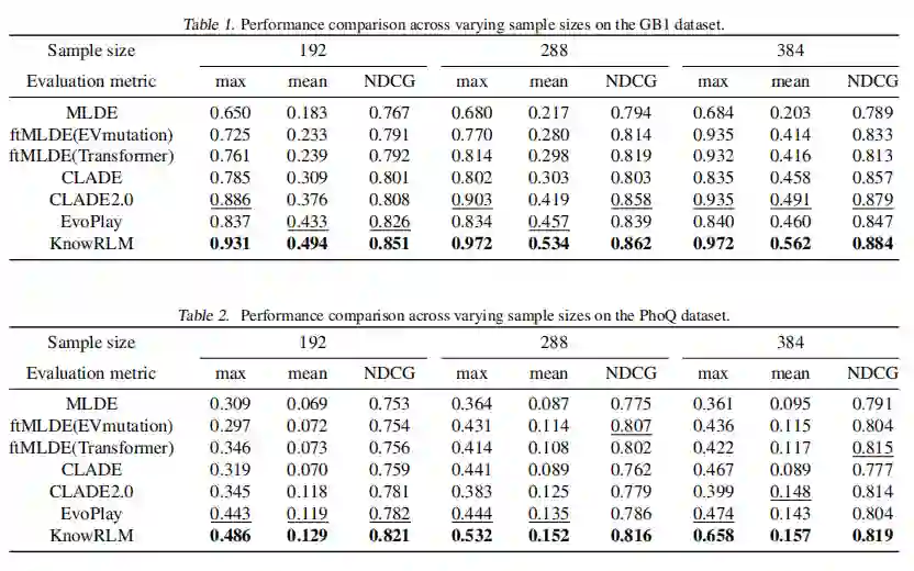 我们的研究使用了两个广泛认可的公共数据集 GB1和 PhoQ,以评估所提出的 KnowRLM 方法的有效性。GB1 数据集代表了蛋白质 G 的域 B1,这是众多生物过程的关键组成部分。它包括一个包含149,361个注释突变体的综合阵列,来源于一个可能的160,000个组合,集中在四个关键的突变位点:V39、D40、G41和V54。与 GB1 互补,PhoQ 数据集专注于不同的蛋白质,在四个突变位点具有 160,000 个潜在突变体中的 140,517 个带注释的数据点:A284、V285、S288 和 T289。该数据集中的适应度值表明各种 PhoQ 突变体的磷酸酶或激酶活性。