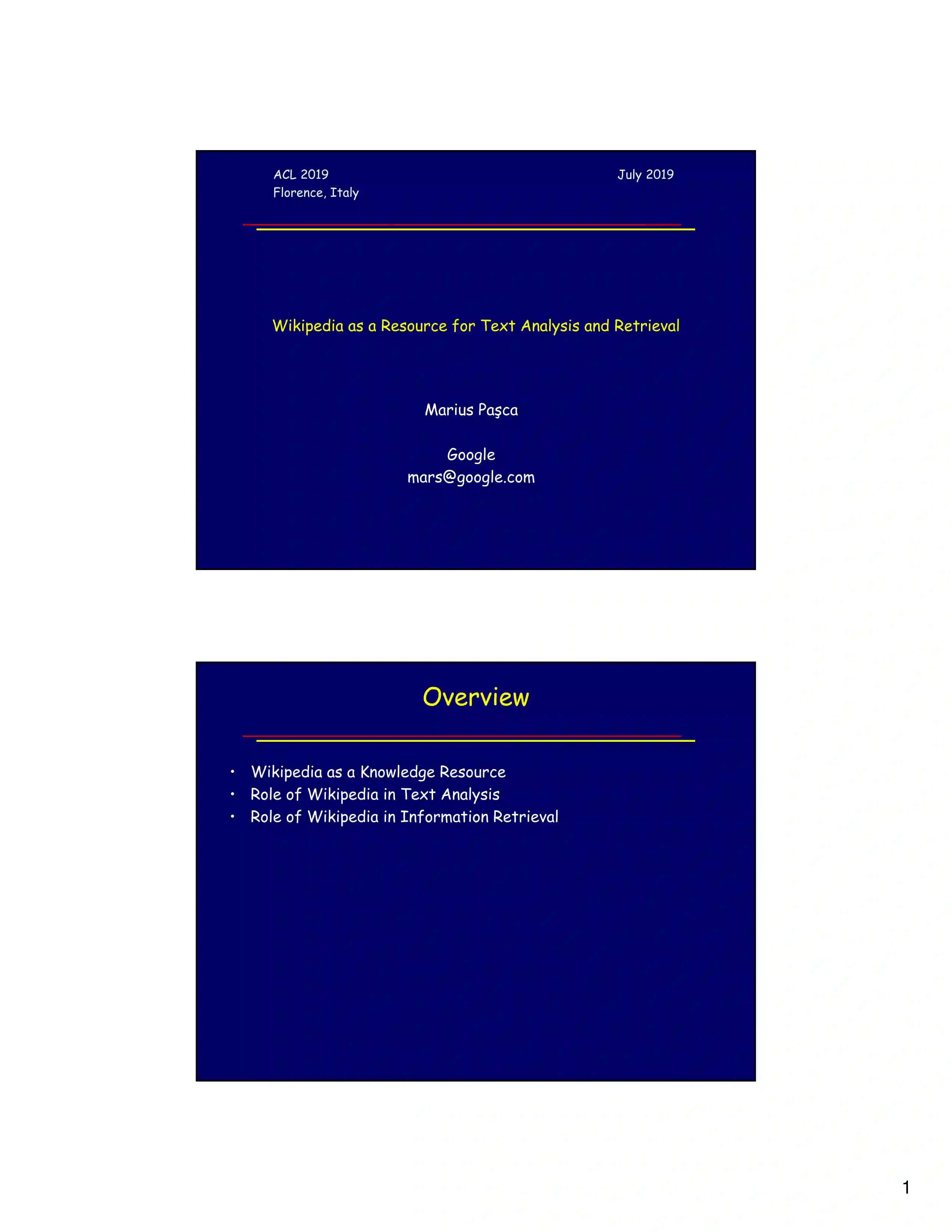 维基百科中由众多网友们参与贡献形成的文章不仅反映了大众或者说网民们越来越广泛的兴趣,也很可能是目前为止最大的公开的、去中心化的非结构化或者半结构化知识库。本教程探讨为维基百科在文本分析和检索相关任务中的作用。利用维基百科的文本分析任务包括共指解析、字义及实体去模糊以及信息提取。