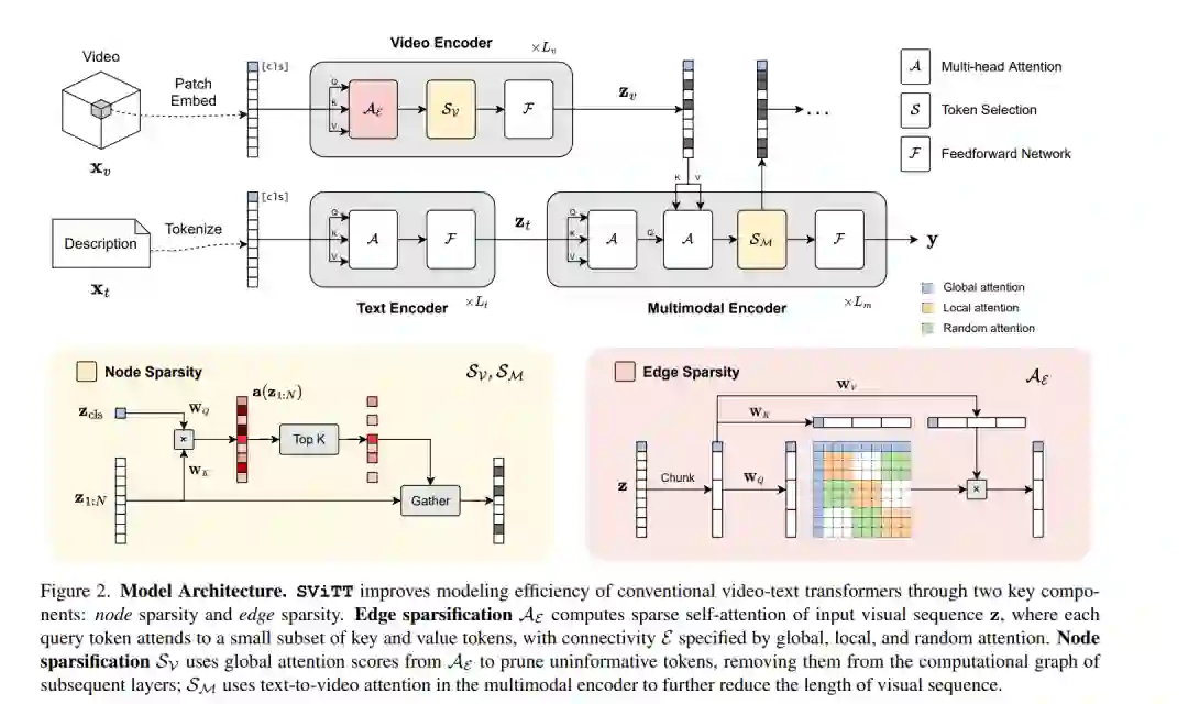 视频-文本Transformer学会跨帧建模时间关系吗?尽管具有巨大的容量和丰富的多模态训练数据,但最近的工作表明视频文本模型倾向于基于框架的空间表示,而时间推理在很大程度上仍未得到解决。本文确定了视频文本transformer时间学习中的几个关键挑战:有限网络大小的时空权衡;多帧建模中的维数灾难问题以及随着剪接长度的增加语义信息的收益递减。在这些发现的指导下,本文提出SViTT,一种稀疏视频-文本架构,执行多帧推理,成本明显低于朴素密集注意力transformer。与基于图的网络类似,SViTT采用了两种形式的稀疏性:边的稀疏性,限制了自注意力中token之间的查询键通信,以及节点的稀疏性,丢弃了没有信息的视觉token。SViTT使用随剪辑长度增加模型稀疏性的课程进行训练,在多个视频-文本检索和问答基准上优于密集transformer基线,计算成本很小。