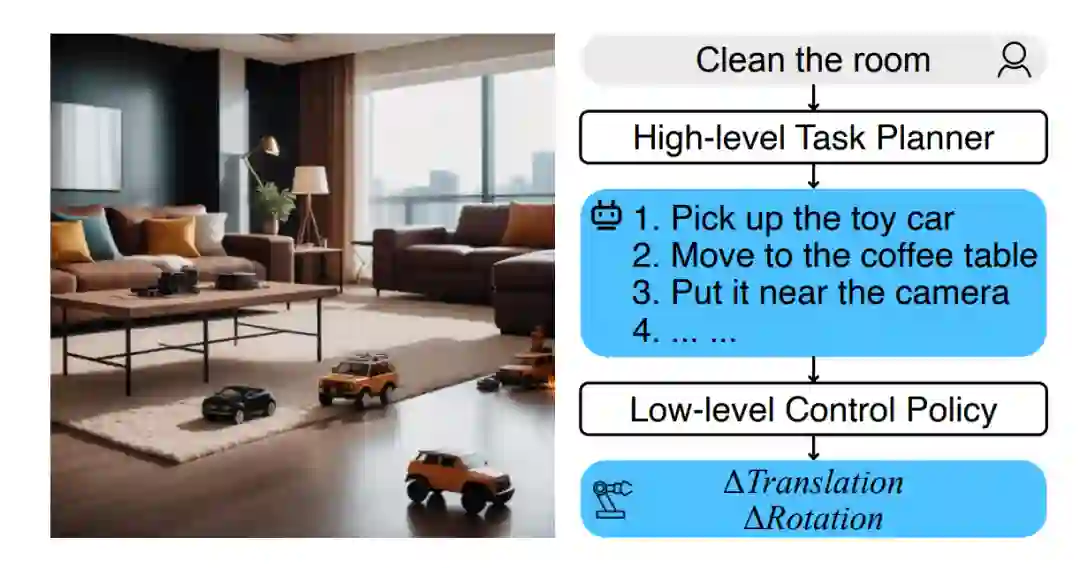 视觉-语言-动作模型(VLA)是处理视觉和语言的多模态输入并输出机器人动作以完成具身任务的模型。它们作为具身智能领域中指令跟随机器人策略的基石。这些模型依赖于强大的视觉编码器、语言编码器和动作解码器。为了提升在各种机器人任务中的表现,一些VLA优先获取卓越的预训练视觉表示(见III-A节);另一些则专注于优化低级控制策略,能够接收短期任务指令并生成通过机器人运动规划可执行的动作(见III-B节);此外,还有一些VLA从低级控制中抽象出来,专注于将长远任务分解为由低级控制策略可执行的子任务(见III-C节)。因此,低级控制策略和高级任务规划器的结合可以视为层次化策略,如图3所示。本节内容组织涵盖了这三个主要方面。
