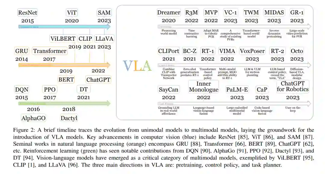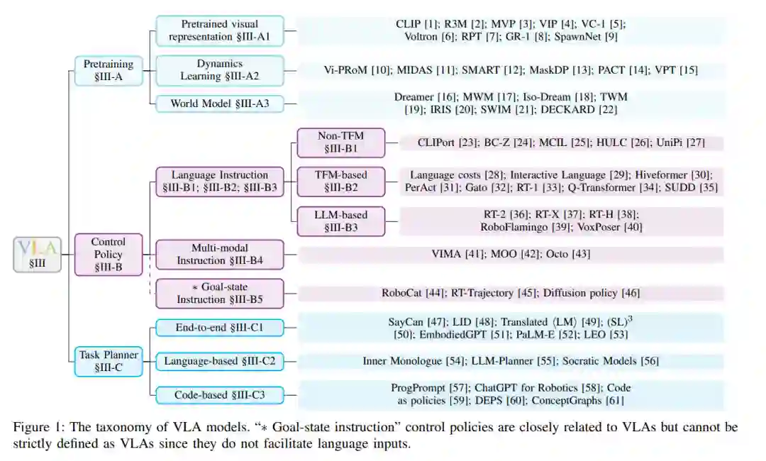 视觉-语言-动作模型(VLA)代表了一类旨在处理多模态输入的模型,结合了视觉、语言和动作模态的信息。该术语最近由RT-2 [36]提出。VLA模型被开发用于解决具身智能中的指令跟随任务。与以ChatGPT [62]为代表的对话式AI等其他形式的AI不同,具身智能需要控制物理实体并与环境互动。机器人是具身智能最突出的领域。在语言条件的机器人任务中,策略必须具备理解语言指令、视觉感知环境并生成适当动作的能力,这就需要VLA的多模态能力。相比于早期的深度强化学习方法,基于VLA的策略在复杂环境中表现出更优越的多样性、灵活性和泛化性。这使得VLA不仅适用于像工厂这样的受控环境,还适用于日常任务,如烹饪和房间清洁 [33]。 深度学习的早期发展主要由单模态模型组成。在计算机视觉(CV)领域,AlexNet [63]展示了人工神经网络(ANNs) [64]的潜力。循环神经网络(RNNs) [65]为许多自然语言处理(NLP)模型奠定了基础,但近年来,Transformers [66]逐渐占据了主导地位。深度Q网络证明了ANNs能够成功解决强化学习问题。借助于各个机器学习领域单模态模型的进步,多模态模型已经演变得足够强大,可以应对各种任务 [67],如视觉问答、图像描述和语音识别等。 基于强化学习的传统机器人策略主要集中在受控环境中的有限任务集,如工厂和实验室。例如,[68]训练了一个专门用于抓取物品的策略。然而,对于更具多样性的多任务策略的需求正在增长,类似于最近在大型语言模型(LLMs) [62], [69]和视觉-语言模型(VLMs) [70]中的发展。开发多任务策略更具挑战性,因为它需要学习更广泛的技能并适应动态和不确定的环境。此外,任务规范增加了另一个层次的复杂性。一些方法使用单热向量来选择任务 [71],但它们受限于训练集中任务的数量。 基于预训练视觉基础模型、大型语言模型(LLMs)和视觉-语言模型(VLMs)的成功,视觉-语言-动作模型已经证明其在应对这些挑战方面的能力。来自最新视觉编码器的预训练视觉表示帮助VLA在感知复杂环境时提供更精确的估计,如物体类别、物体姿态和物体几何形状。随着语言模型 [36], [69]能力的增强,基于语言指令的任务规范成为可能。基础VLMs探索了将视觉模型和语言模型整合的多种方式,包括BLIP-2 [72], Flamingo [70]等。这些不同领域的创新赋予了VLA解决具身智能挑战的能力。 不同的VLA在重点方面有所不同,如图1所示的分类法所描述。一些VLA通过为机器人任务专门设计的预训练任务来增强其预训练的视觉表示,主要集中在获取改进的视觉编码器。同时,大量工作致力于机器人控制策略。在这一类别中,语言指令被输入到控制策略中,策略根据环境生成动作。这些动作随后被传送到运动规划器以执行。相反,另一类VLA作为高级任务规划器,抽象掉了低级控制。这些模型专注于将长远的机器人任务分解为可执行的子任务。这些子任务然后由控制策略逐一完成,最终完成整个任务。 相关工作。尽管目前缺乏针对VLA的综述,但相关领域的现有综述为VLA研究提供了宝贵的见解。在计算机视觉领域,综述涵盖了从卷积神经网络 [73]到Transformers [74]的各种视觉模型。自然语言处理模型在综述 [75], [76]中得到了全面总结。强化学习的深入综述可在综述 [77]–[79]中找到。图神经网络的综述也有相关文献 [80]。此外,现有的视觉-语言模型综述为VLA提供了灵感 [67], [81]–[83]。另外,也有一篇关于早期具身智能工作的综述 [84]。 贡献。这篇综述是具身智能领域首篇深入的视觉-语言-动作模型综述。