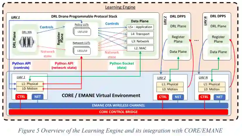 图4报告了DRL无人机可编程协议栈(DRL DPPS)架构的概况。DRL DPPS用于单个无人机,在协议栈的所有层进行运动和无线操作,也用于控制框架的学习引擎,以训练和测试特定任务目标的NN策略制定。在后者中,物理层和运动操作由虚拟化的CORE/EMANE环境执行,而在前者中,这些操作通过硬件运动和射频前端实现。