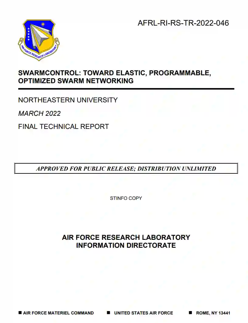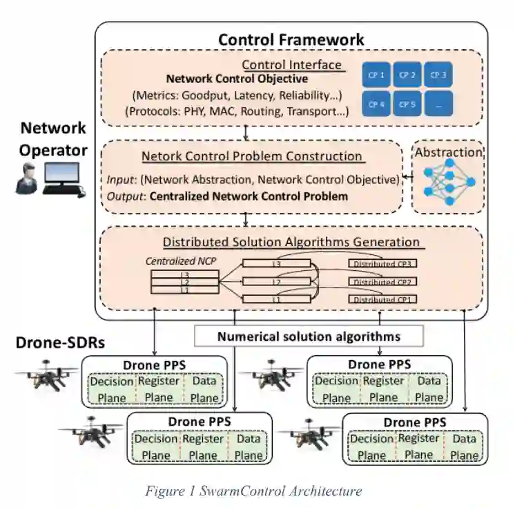 尽管有上述优势,但如何部署能够自适应和自组织的无人机群,以提供可靠、高性能和无处不在的服务并不是一件容易的事。事实上,网络的无线和分布式性质使无人机暴露在干扰、障碍物和不断变化的信道条件下,可能会对网络运行产生负面影响(或者在最坏的情况下完全阻止)。这些挑战在成功取决于无人机、移动终端用户、基站、运营中心等之间无线通信的可靠性和效率的应用中更为重要。在这个项目中,我们通过设计、开发和原型验证SwarmControl,推进了无人机网络群的技术水平,这是一个新的软件定义的无人机群控制框架,其目标是实现网络操作的自动和智能重新配置,以保证高性能并适应不断变化的网络条件。SwarmControl结合了各种优化和数据驱动工具、软件定义无线电(SDR)和分布式网络控制原则,为网络操作者提供了一个统一的网络和飞行控制功能的抽象。有了SwarmControl,操作员可以通过在一个集中的抽象上指定无人机网络的高级控制指令和要求来定义和实施复杂的网络控制问题。SwarmControl(i)构建网络操作员指令的网络控制问题表示;(ii)将其分解为一组分布式子问题;以及(iii)自动生成数据驱动和分布式优化解决方案算法,在各个无人机上执行。