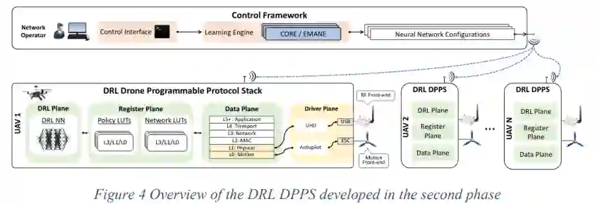 我们设计了一个由控制框架和DRL DPPS组成的两层架构。网络运营商使用控制框架来决定分布式无人机网络的预期行为。我们的解决方案自动生成一组DRL代理(即一组神经网络(NN)形式的政策),这些代理在控制框架内的虚拟环境中进行训练。训练完成后,NN配置经过测试并自动分发到各个网络节点,在那里它们将被用来控制DRL DPPS中的网络和运动参数。通过这种方式,各个无人机通过实时优化其网络性能,分布式地实现网络运营商的目标。