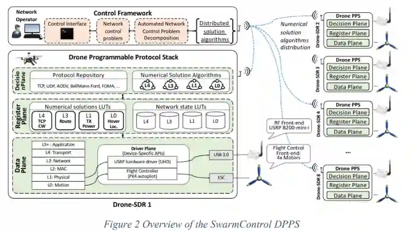 无人机可编程协议栈(DPPS)。如图1所示,DPPS安装在每个单独的无人机上,以分布式和自动化的方式解决从控制框架收到的数值解算法。DPPS跨越了网络协议栈的所有层次,并与飞行控制器固件紧密互动。DPPS为复杂的跨层和跨域网络协议的原型化提供了必要的构件和基元,允许在协议栈的所有层对网络、传感和运动参数进行完全控制。
