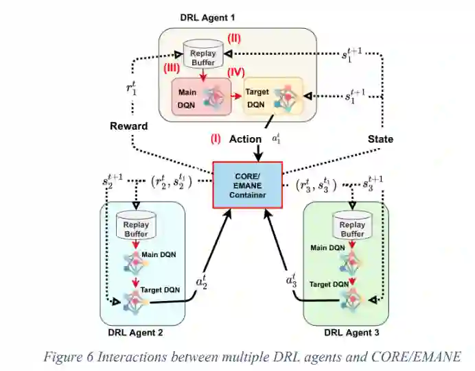 图5说明了DRL DPPS和CORE/EMANE之间的架构整合。在控制框架的学习引擎中,虚拟训练环境和虚拟测试环境都使用了相同的架构。此外,图6描述了DRL智能体(即嵌入SwarmControl的DRL DPPS的无人机)之间的互动,其中我们展示了多个DRL代理如何与CORE/EMANE中模拟的同一环境进行互动。值得一提的是,尽管每个DRL智能体在一个单独的容器中执行,但它们都通过所有DRL智能体共享的同一个CORE/EMANE容器进行交互。