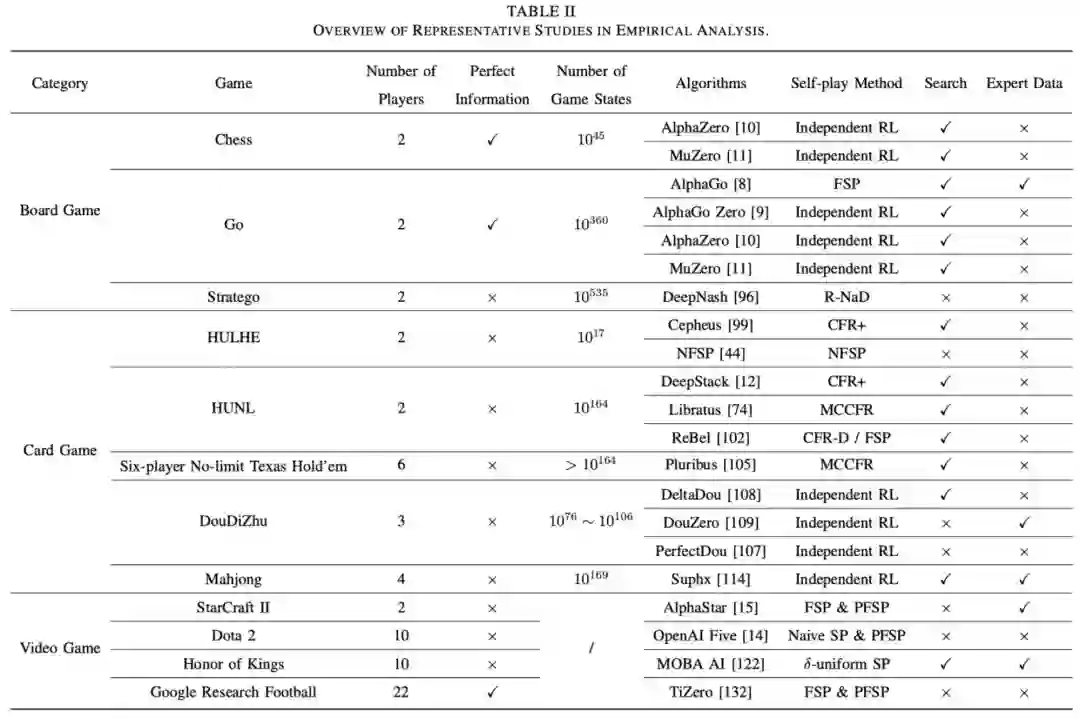 在本节中,我们通过将三类经典场景来介绍自博弈的经典应用:棋类游戏,通常涉及完全信息;牌类游戏(包括麻将),通常涉及不完全信息;以及电子游戏,具有实时动作而非简单回合制游戏。