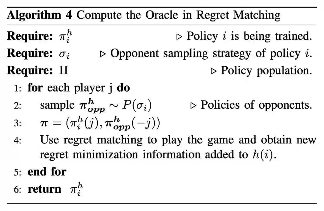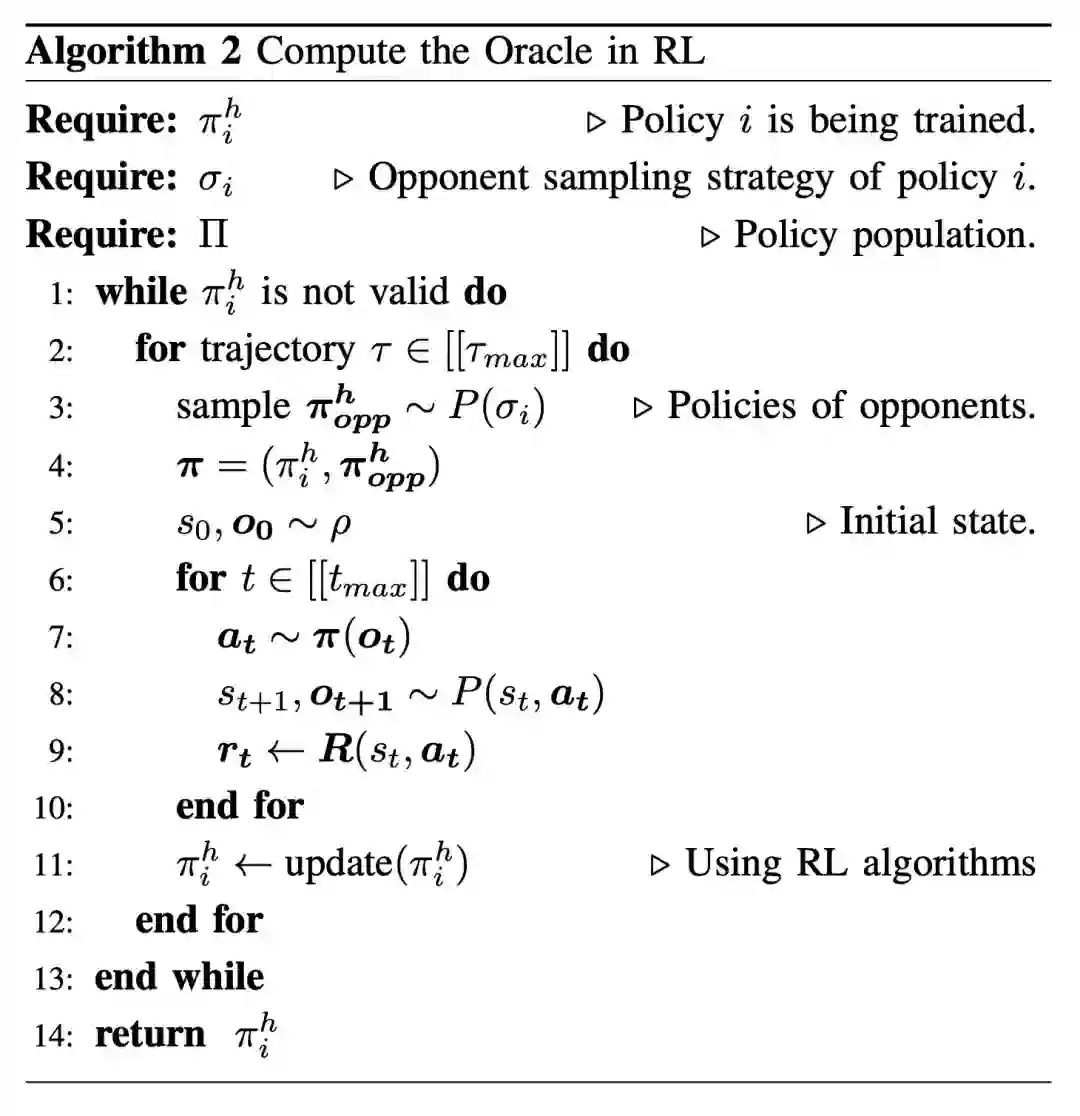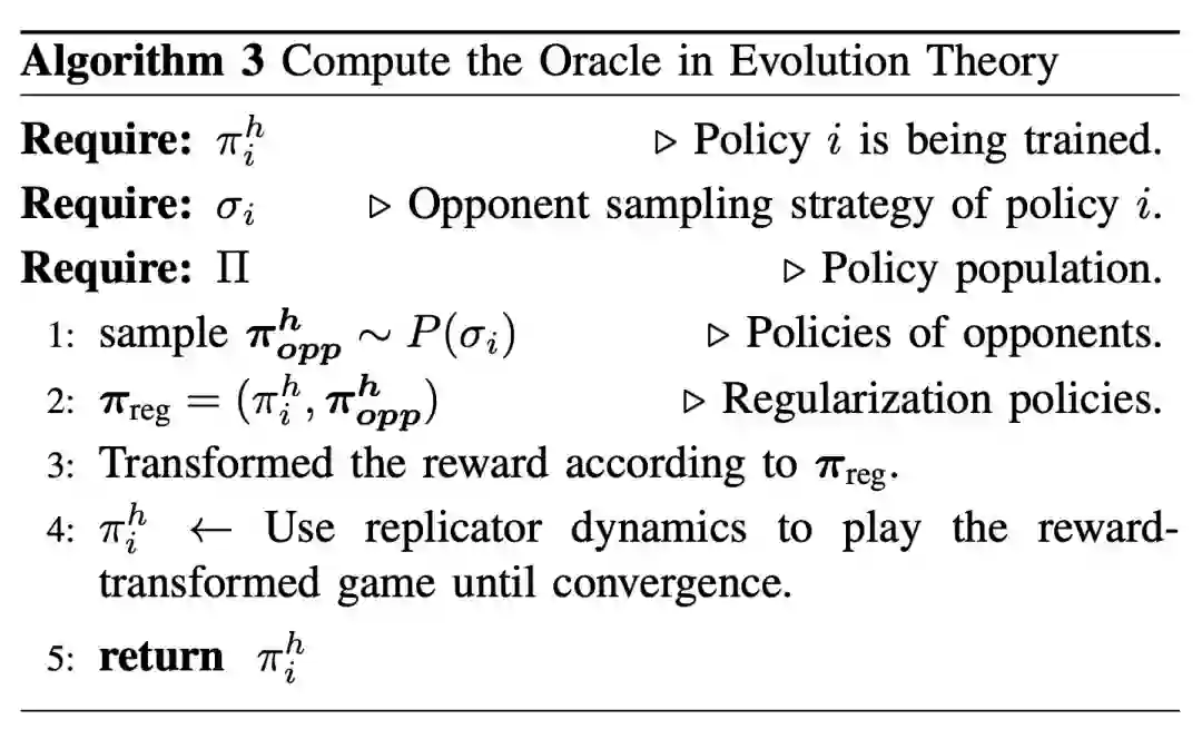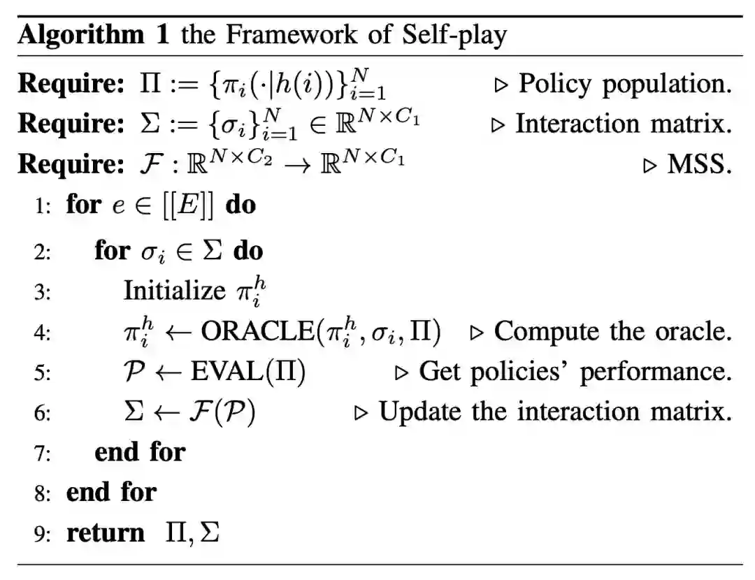 ● : 元策略求解器(Meta Strategy Solver,MSS)。输入是表现矩阵 ,并生成一个新的交互矩阵 作为输出。 表示策略 的表现水平。该框架(算法1)的核心步骤说明:● 算法1伪代码第1行: 表示整个策略集合的总训练轮数,也即策略池中每个策略的更新次数。● 算法1伪代码第3行:各个策略初始化可以选择随机初始化、预训练模型初始化或者是继承之前训练完成的策略进行初始化。● 算法1伪代码第4行:可以选用不同的 ORACLE 算法得到训练策略,最直接的方式是计算 BR 。但是由于对于复杂任务来说,直接计算 BR 难度高,因此通常选择训练近似BR来训练策略,可以采用强化学习(算法2),进化算法(算法3),后悔最小化(算法4)等方法。