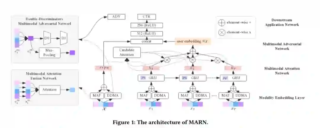 为了更好的用户体验和业务效能,点击率(CTR)预测一直是电子商务中最重要的任务之一。虽然已经提出了大量的CTR预测模型,但从多模态特征中学习项目的良好表示仍然较少研究,因为电子商务中的一个项目通常包含多个异质模态。以往的作品要么将多个模态特征串联起来,相当于给每个模态一个固定的重要性权重;或者通过注意力机制等技术学习不同项目不同模式的动态权重。然而,一个问题是,通常存在跨多个模态的公共冗余信息。利用冗余信息计算不同模态的动态权值,可能不能正确反映不同模态的不同重要性。为了解决这个问题,我们通过考虑模态特性和模态不变特性来探索模态的互补性和冗余性。针对CTR预测任务,我们提出了一种新的多模态对抗表示网络(MARN)。多模态注意网络首先根据每个项目的模态特征计算其多模态的权重。然后,一个多模态对抗网络学习模态不变表示,在此基础上引入双鉴别器策略。最后,我们将模态特定表示与模态不变表示相结合,实现了多模态项表示。我们在公共数据集和工业数据集上进行了大量的实验,所提出的方法不断地对最先进的方法进行显著的改进。此外,该方法已应用于实际的电子商务系统,并在网上进行了A/B测试,进一步证明了该方法的有效性。