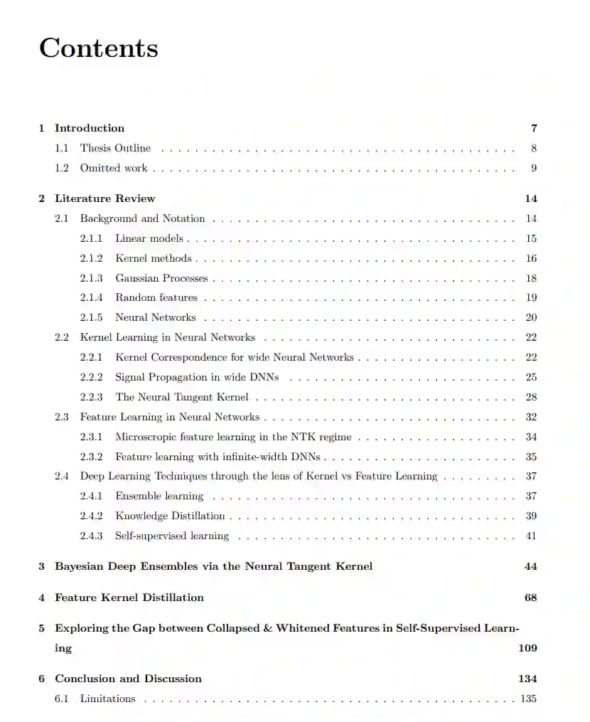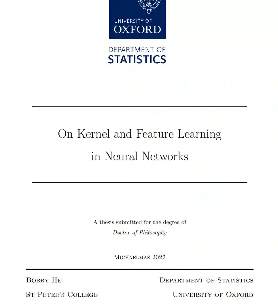受宽神经网络(NNs)理论的启发,核学习和特征学习近期作为两个范式浮现出来,通过它们我们可以实际理解大规模深度学习系统的复杂行为。在文献中,它们通常被描述为二分法的两个对立面,各自具有优点和缺点:核学习与经过深入研究的机器学习技术(如核方法和高斯过程)建立联系,而特征学习则承诺捕捉更多丰富而尚未解释的,独特于神经网络的属性。在这篇论文中,我们介绍了三项研究,研究结合了来自两个角度的见解来研究神经网络的性质,不仅强调它们的差异,而且强调共同点。我们首先回顾了有关深度学习理论的相关文献,重点是宽神经网络的研究。这为核学习和特征学习的讨论提供了背景,基于此,我们继续描述我们的贡献。首先,我们研究了宽神经网络集合与贝叶斯推断之间的关系,利用核学习与高斯过程之间的联系,并提出了一种修改,以解释神经网络函数在初始化时缺失的方差,从而使我们训练过的深度集合具有贝叶斯解释。接下来,我们结合核学习和特征学习来展示特征核的适用性,即通过最终层神经网络特征的内积引导的核,作为知识蒸馏的目标,其中人们寻求使用强大的教师模型来提高弱学生模型的性能。最后,我们探讨自监督学习中折叠特征和白化特征之间的差距,强调特征核中特征值的衰减率作为一项关键量,它弥合了这一差距,并影响下游泛化性能,特别是在标记数据稀缺的情况下。我们以讨论我们的贡献,包括局限性和未来展望,作为结论。