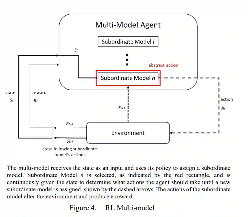 军事模拟既是培训工具,也是分析手段。在训练方面,模拟为领导者提供了一个机会,让他们做出名义上的重大决策,并演练这些决策的后果。另外,分析性模拟还提供了一种测试能力、部队设计和理论的反复且相对廉价的方法。鉴于所需的专业知识和数据,通过脚本或模仿学习的方式为大规模作战模拟实施人工智能(AI)似乎令人生畏;然而,最近业界在强化学习方面取得的成功,开发出了能玩商业电子游戏的人工智能,这提供了一条令人兴奋的前进道路。多模型方法与强化学习相结合,在行动空间和可扩展性方面相对简单,因此在军事模拟中具有巨大潜力。多模型方法不使用结构复杂的组合式行动空间进行强化学习,而是使用下级人工智能模型作为智能体的行动空间,有效地委托下级行动决策。本研究提供了强化学习(RL)多模型和分级多模型的概念验证,分级多模型是一种利用军事单位固有分级结构的多模型类型。此外,本文还展示了时间抽象和方向变换器的应用如何提高分层多模型的性能。
