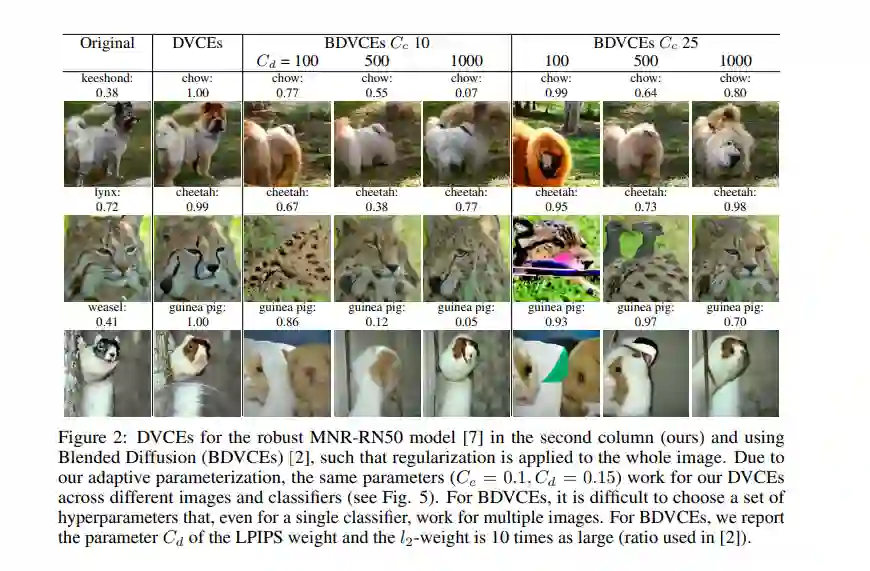 视觉反事实解释(VCEs)是理解图像分类器决策的重要工具。它们是“小”但“现实”的图像语义变化,改变了分类器的决策。当前生成VCEs的方法局限于对抗鲁棒模型,通常包含非现实的人工制品,或者局限于类别较少的图像分类问题。在本文中,我们通过扩散过程为任意ImageNet分类器生成扩散视觉反事实解释(DVCEs)来克服这一问题。对扩散过程的两个修改是我们的DVCEs的关键:首先,自适应参数化,其超参数在所有图像和模型中都具有泛化性,再加上距离正则化和扩散过程的后期开始,使我们能够生成对原始图像具有最小语义变化但分类不同的图像。其次,我们通过对抗鲁棒模型的锥正则化确保扩散过程不会收敛到琐细的非语义变化,而是生成目标类的真实图像,分类器获得了高可信度。代码可在https://github.com/valentyn1boreiko/DVCEs下获得。