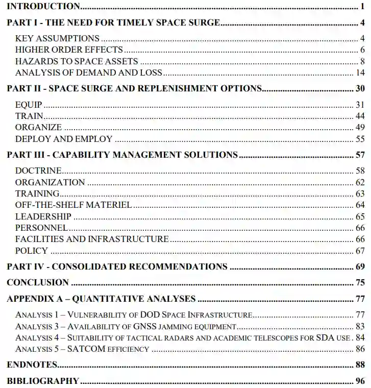 要在各个领域取得成功,就必须有强大的太空作战能力,因此,要想在作战中取得成功,就必须有能力迅速恢复丧失的能力,并在太空能力丧失和减员的情况下快速部署太空作战行动。本研究认为,在通过常规物资采购和人员加入扩大部队规模不可行的情况下,仍然可以获得短时间内扩大太空行动所需的装备、组织和训练有素的部队。通过对特定反太空威胁的透视分析,对其他领域解决方案的定性分析和定量评估表明,采用非常规太空能力,以及利用新兴的条令、培训、物资和人员领导力,为太空部队的快速激增提供了一条可行之路。