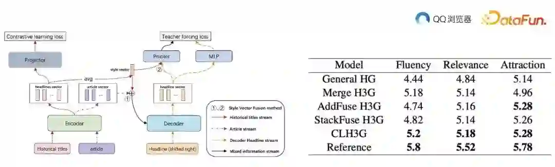 为了生成更具吸引力、相关性和流畅性的标题,我们采用了基于 transformer 模型的方法,并将作者的历史标题信息融入其中。首先,为了构建训练数据集,我们对每天发文量特别多的搬运号和发文量特别少的创作者进行过滤。接着,根据作者的历史标题,构造一个三元组(<文章,历史标题,想要的标题>)数据集。这些数据将作为输入来训练 transformer 模型。在 transformer 模型中,encoder 主要负责提取输入文本的语义信息。然而,仅通过计算 n 个历史标题的 embedding 并对其进行平均,很难得到作者风格的表征。为解决这个问题,我们引入了对比学习的方法。在 batch 内,同一作者的标题两两组成正例,不同作者的标题两两组成负例。这样进行训练,可以使模型的表征更倾向于捕捉作者风格,而非单纯的语义信息。实验结果表明,引入作者风格的标题生成模型在 Rouge 和 BLEU 评估指标上有所提升。与原始模型相比,新模型生成的标题具有更高的流畅性、相关性和吸引力,同时能够保持与作者风格的一致性。这说明,通过利用作者历史标题信息,我们可以成功地生成更符合作者风格的标题,从而提高用户体验。