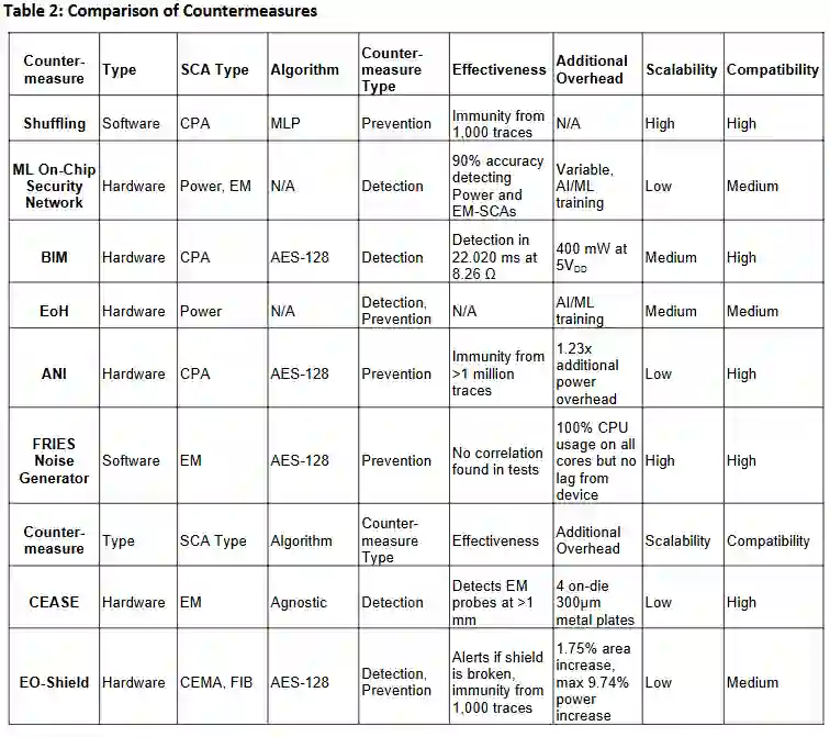 本综述的主要目标是整合现有关于基于功耗和电磁的侧信道攻击对策的研究,比较这些对策以识别其优缺点,并推动关于对策整体的讨论。最后,我们基于这些发现指出了未来的研究方向。随着威胁不断适应和演变,理解这些攻击及其防御措施对于增强密码系统的安全性至关重要。
