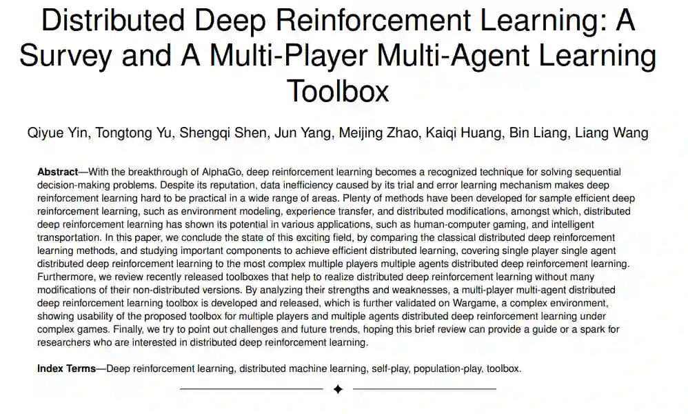 本文通过比较经典的分布式深度强化学习方法,研究实现高效分布式学习的重要组成部分,总结了这一激动人心的研究领域的现状,从单一玩家单一智能体分布式深度强化学习到最复杂的多玩家多智能体分布式深度强化学习。此外,我们回顾了最近发布的有助于实现分布式深度强化学习的工具箱,而无需对其非分布式版本进行大量修改。在分析其优缺点的基础上,开发并发布了多玩家多智能体分布式深度强化学习工具箱,并在复杂游戏环境Wargame上进行了进一步验证,显示了该工具箱在复杂游戏环境下多玩家多智能体分布式深度强化学习的可用性。最后,我们试图指出分布式深度强化学习的挑战和未来的发展趋势,希望通过本文的简要回顾可以为那些对分布式深度强化学习感兴趣的研究者提供指导或启发。