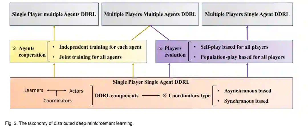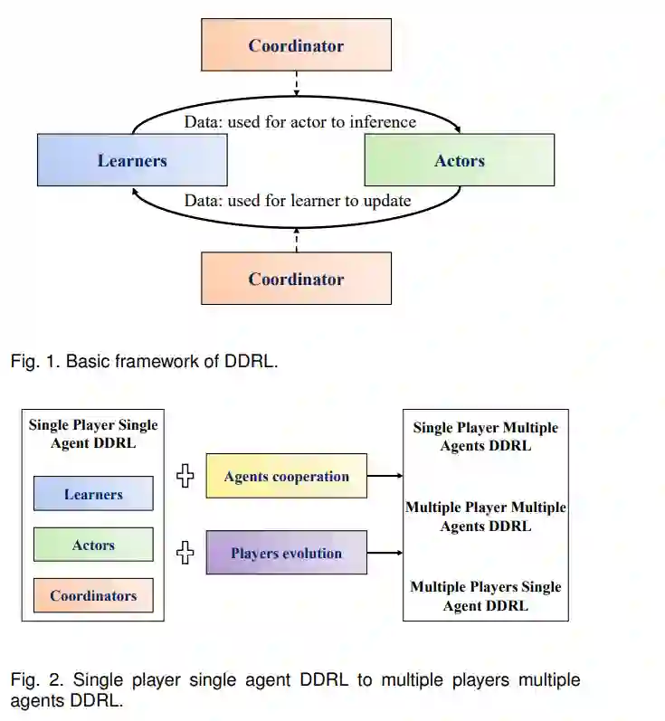 本文的其余部分组织如下。在第二节中,我们简要介绍了DRL的背景、分布式学习和典型的DDRL测试平台。在第3节中,我们详细阐述了DDRL的分类。在第4节中,我们将比较当前的DDRL工具箱,这些工具箱在很大程度上帮助实现了高效的DDRL。在第5节中,我们介绍了一个新的多玩家多智能体DDRL工具箱,它为复杂游戏提供了一个有用的DDRL工具。在第6部分,我们总结了DDRL的主要挑战和机遇,希望能启发未来的研究。最后,我们在第7节对本文进行了总结。