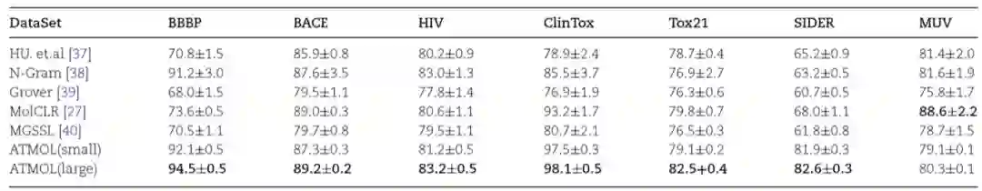 图2:左,4种添加mask的方式对预测结果的影响。右,添加mask的比例对预测结果的影响。作者还将ATMOL与前人报道的5种基于自监督的分子表征算法同时用于分子性质的预测,进行比较。结果显示ATMOL总体优于其它5种算法,且基于大数据集的ATMOL算法在某些测试集上效果提升格外明显(表2)。表2:ATMOL与其它5种算法预测分子性质结果比较。