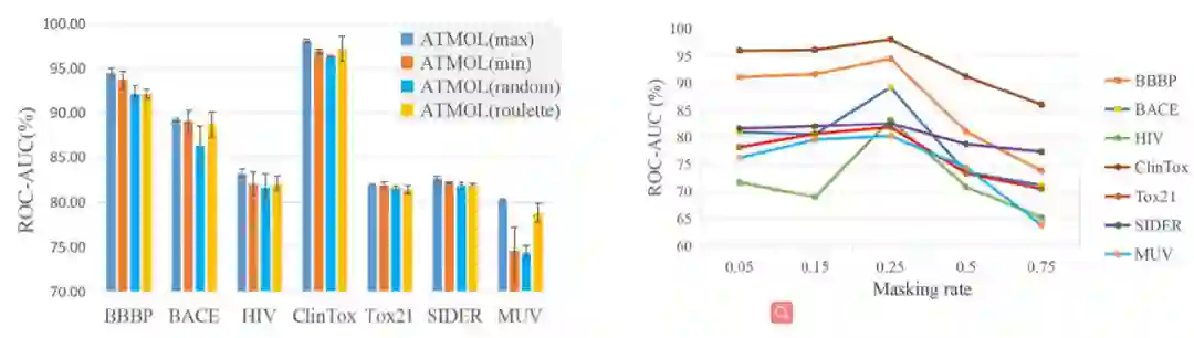 添加mask的方式包括随机添加或根据attention权重添加,结果显示对attention权重最大的边和节点添加mask效果最好,而以往常用的随机添加mask则效果最差(图2,左)。经过测试,作者发现添加25%(占所有边和节点的比例)的mask效果最好,说明低比例的mask无法产生有效的增广图,而高比例的mask则可能破坏了重要的分子结构从而导致预测结果变差(图2,右)。除此之外,作者还利用不同大小的数据集分别训练模型,结果显示基于大数据集上的结果优于基于小数据集上的结果。