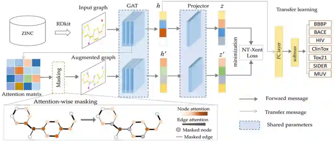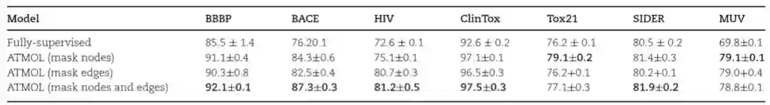 图1:分子性质预测算法ATMOL的流程示意图。如图1所示,完整的算法分为两大部分,第一部分是对分子进行编码的预训练模型,第二部分是用于下游分子性质预测的迁移学习。其中预训练模型的数据来自ZINC数据库,迁移学习的数据来自MoleculeNet数据库。第一部分预训练模型包含3个关键的步骤:(a)首先作者基于SMILES对输入的分子构建分子图,然后使用图注意力网络(Graph Attention Network,GAT)将分子图编码到隐空间。(b)对编码后的分子图,根据GAT编码器学习到的attention权重对边或节点添加mask,从而产生增广的分子图。(c)通过最小化增广分子图与原始分子图之间的对比损失(Contrastive loss)来捕获重要结构和高阶语义,优化分子表示。对于训练好的分子表示模型,第二部分将固定预训练模型的参数不变,提取分子表示用于迁移学习,仅通过训练两个全连接层来预测分子性质。**——预测效果——**作者从多个维度对算法的设置进行了检验,并对预测效果进行了评估。对于分子性质的预测,作者在包含多种分子性质的7个数据库上进行测试。首先,作者将基于Attention-wise mask的预训练模型与基于监督学习的方法进行比较,发现算法ATMOL所用的对比学习预训练模型对分子性质的预测效果显著好于基于监督学习的方法,并且同时对分子图的边和节点添加mask比只对边或节点添加mask效果更好。表1:比较ATMOL方法与基于监督学习的方法预测分子性质的结果。表头表示在7个不同的数据库上的预测结果。