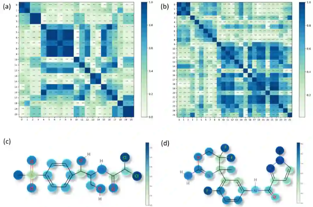 图3:Attention权重可视化示例。(a)和(c)代表同一个分子;(b)和(d)代表同一个分子。**——总结与讨论——**邓磊课题组提出的ATMOL算法,构建了一个基于attention-wise masking的对比学习预训练模型,在预测分子性质的任务上取得了不错的提升。值得注意的是,作者认为对attention权重最大的部分添加mask,能够扩展负样本并使其更加多样化,从而有利于提高对比学习的效果。作者对算法可解释性的探索,也显示了ATMOL具有提取分子关键结构的潜力。参考文献: