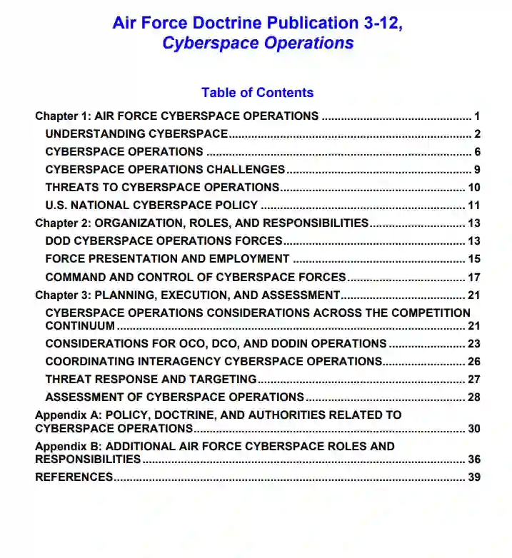 空军的所有行动都依赖于赛博空间,这个领域正受到越来越多的挑战和争夺。如同对空气的控制,赛博空间的控制为联合部队提供了行动自由,并减少了在赛博空间领域内和其他领域内对敌人攻击的脆弱性。实现和保持赛博空间的优势是整体作战和战略优势的一个基本组成部分,特别是对于针对同行和近邻对手的行动。由于赛博空间的复杂性,全球优势是不可能实现的。在某些情况下,甚至局部的优势也可能是不切实际的。为了确保联合全域战(JADO)的成功,指挥官应该预期有争议的赛博空间行动,并考虑到预期的能力退化。