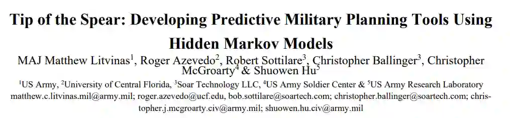 随着新技术的出现,现代战场的演变日益复杂。然而,战场的本质仍然可以用德-约米尼男爵的 “大战术 ”来解释。军事规划者的成功在于他们有能力在战场的决定性时刻,通过复杂系统的分层效应形成协同效应。协同效应需要在规划单元中工作的主题专家(SME)在时间和空间上整合系统和单元。本文探讨了如何应用隐马尔可夫模型(HMMs)来增强现有的兵力与均势相关性(COFM)计算器,将其作为军事规划中的预测工具。目前的工具侧重于用被称为等效因子的标量调整进攻行动的 3 比 1 兵力比。这些工具缺乏识别战场时间和空间物理特性的能力。在计划和训练过程中利用兵棋推演为严肃游戏改进计划工具提供了场所。本研究采用了在 OneSAF 中生成的场景,从简单的排级伏击到以旋翼资产为特色的联合作战机动,这些场景都需要进行塑造以确保有利的 COFM。重点是利用 HMM,使用潜在的可观测数据建立成功概率的时间序列指标,重点是通信动态。在本研究中,我们通过视觉和直接接触产生的数据来研究可观察到的通信。通过观察部队之间的接触,可以预测相对优势在时间和空间上的隐藏状态。通过 OneSAF 模拟生成的数据,HMM 可以确定行动的状态和成功概率,同时最大限度地减少单元内部所需的存在。