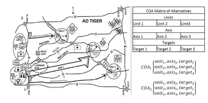 联合作战规划过程往往是数据、人力和时间密集型的,行动方案(COA)必须在敌方决策周期内规划和执行,同时为下级指挥层留出规划时间。这意味着计算负担会随着现代作战空间中系统和行动者数量的增加而急剧加重。此外,规划过程中最耗时的部分是 COA 分析和兵棋推演。这就凸显了我们的研究目标:开发一种方法,利用新的流程来分析和评估 COA 备选方案,从而为军事规划人员提供帮助。