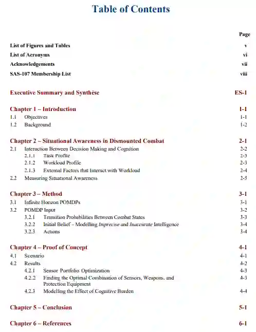 专门用于下马士兵系统的国防资金是有限的,而且必须在多个部分之间进行分配。决定正确的组合可能是困难的--一些技术提高了杀伤力和保护力,另一些则提高了安全性能。同时,这些技术可能会增加认知和身体负荷。本报告提出了一种方法来进行跨越这一明显的鸿沟,并找到技术的最佳组合。提出了一个数学战斗模型,该模型考虑了态势感知、杀伤力和保护设备在预期挽救生命方面的联合效应。因此,该模型可以用来设计一个最佳的下马士兵系统,一个可以拯救人生命的系统。