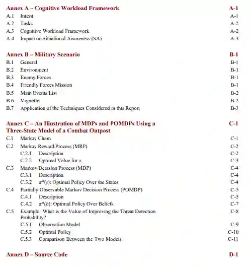 该模型在采购、能力发展、国防科技和学术领域具有开发潜力。这种广泛的潜力要归功于POMDPs的灵活性,它可以根据需要做得很抽象,或者很详细。提出了几个扩展模型实现的途径:整合贝叶斯信念网络(在CTMC和/或观察模型中),结合情景阶段的序列,并探索其他表示认知负担的方法。