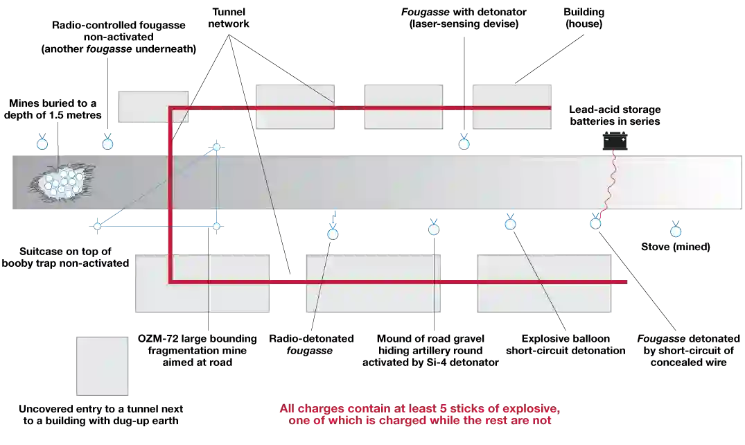 在居民区外围,敌人准备反坦克壕沟和土堤,通常使用推土机(装甲或非装甲)进行此类作业。射击阵地设在建筑物的一楼,并用石箱和沙袋加固。用石箱和沙袋加固的墙壁,用于隐蔽和保护建筑物间的移动,而地下室掩体则保护战斗人员免受炮火和空袭。建筑物之间的地下隧道和有顶通道便于预备队、突击群或撤退部队的秘密移动。使用“fougasse”(一种通过在地面或岩石中挖洞并填充炸药和弹丸制成的简易定向抛射地雷)来保护支撑点的接近路径。隐藏的网络摄像头监控敌人危险的接近通道。指挥所、补给点和维修点通常设在地下室,以增强对空袭的防护。使用沙袋和土袋加固二楼和三楼,以提供进一步的对空袭防护。