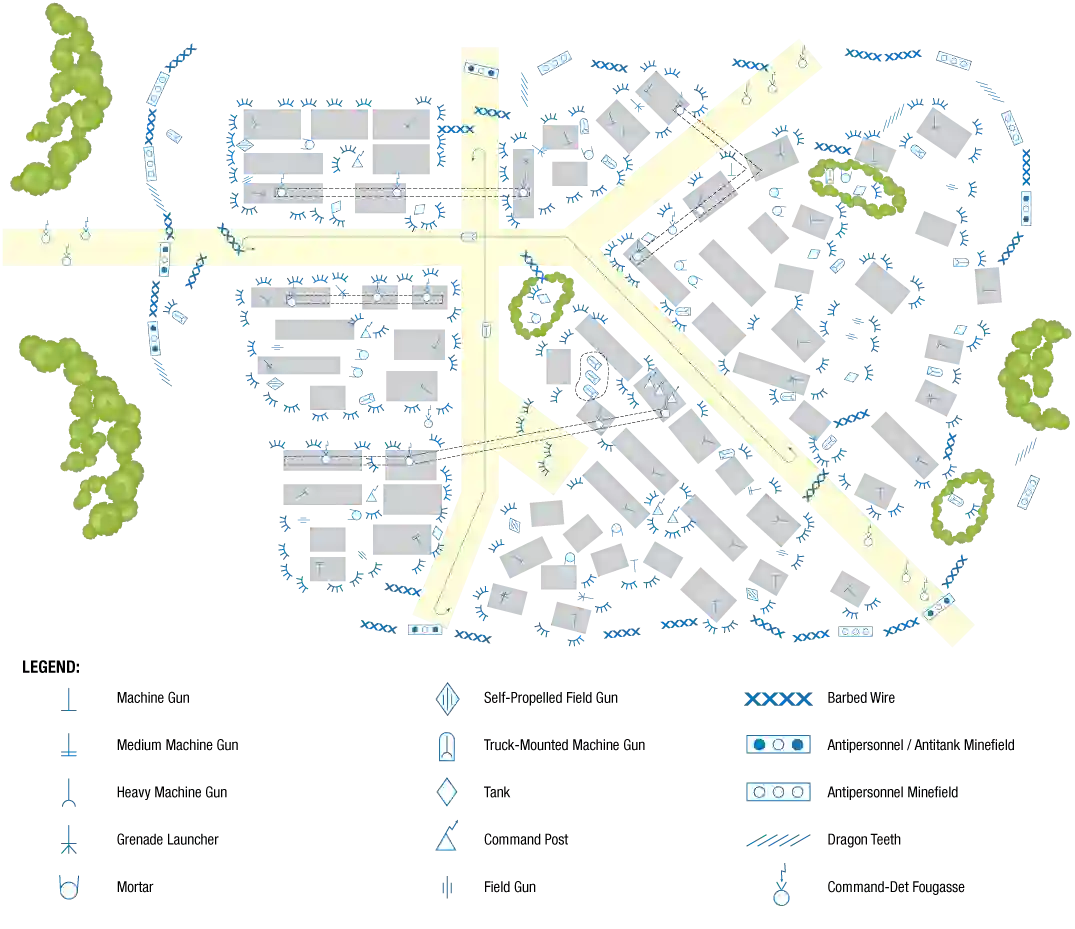 图1展示了一个东欧城市中抵御俄军进攻的建筑密集区,其特点是大型商业建筑和高层公寓楼。外部和内部的定向地雷封锁了主要道路的入口,而杀伤人员及反坦克雷场与铁丝网障碍物一起环绕着城市。