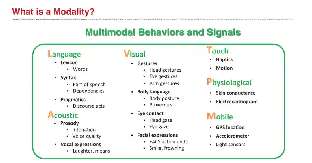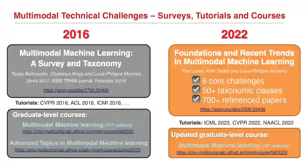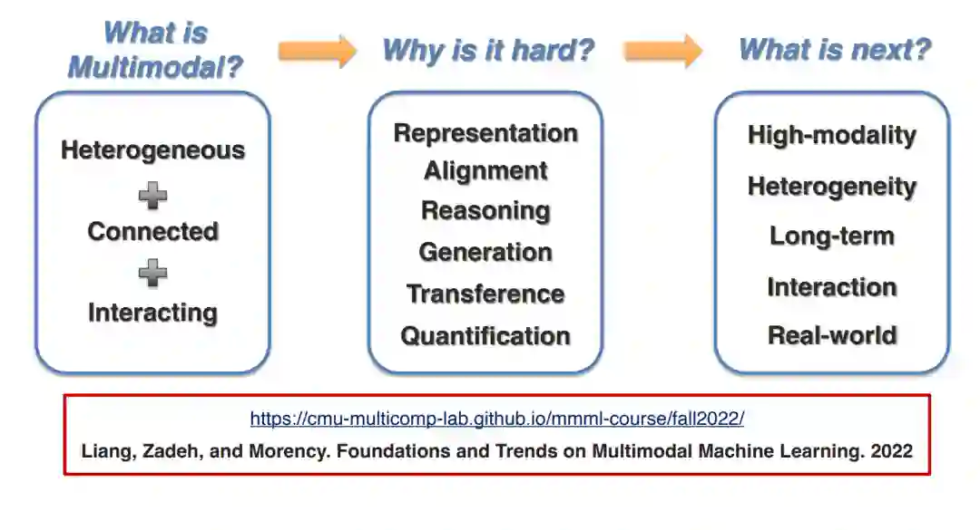 多模态机器学习是一个充满活力的跨学科研究领域,旨在设计具有智能能力的计算机代理,如通过整合多种交流方式(包括语言、声学、视觉、触觉和生理信息)来理解、推理和学习。随着最近对视频理解、具身自主代理、文本到图像生成以及在健康医疗和机器人技术等应用领域的多传感器融合的关注,多模态为机器学习社区带来了独特的计算和理论挑战,考虑到数据来源的异质性和模态之间经常存在的相互联系。然而,多模态研究的广泛进展使人们难以确定该领域的共同主题和未解决的问题。通过综合从历史和近期角度出发的广泛的应用领域和理论框架,本教程旨在提供多模态机器学习的计算和理论基础的概览。 在我们关于多模态ML的新版本的调查论文和CMU的学术课程的基础上,本教程将涵盖三个主题:(1) 什么是多模态:从异质、相连和相互作用的数据中学习的原则;(2) 为什么它难:多模态ML中面临的六大核心技术挑战,但在单模态ML中鲜为人知;以及 (3) 接下来是什么:根据我们的分类法确定的未来研究的主要方向。
