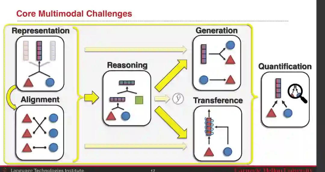 为了建立多模态机器学习的基础,我们首先为数据模式和多模态研究的定义奠定基础,然后确定驱动后续技术挑战和创新的两个关键原则:(1)模态是异质的,因为在不同模态中出现的信息往往表现出不同的质量、结构和表征;(2)模态是相互联系的,因为它们经常相关、共享共性,或在用于任务推断时相互作用产生新信息。基于这些定义,我们提出了多模态机器学习中的六个核心挑战的新分类:表示、对齐、推理、生成、迁移和量化(见图1)。这些构成了传统单模态机器学习中研究不足的核心多模态技术挑战,为了推动该领域向前发展,需要解决这些挑战: 1. 表征: 我们能学习反映个体模态元素之间的异质性和相互联系的表征吗?本文将涵盖以下基本方法:(1)表示融合:整合来自2个或更多模态的信息,有效减少单独表示的数量;(2)表示协调:互换跨模态信息,目标是保持相同的表示数量,但改善多模态语境化;创建一个新的不相交的表示集,其数量通常大于输入集,反映有关内部结构的知识,如数据聚类或因子分解。 2. 对齐:我们如何识别样式元素之间的连接和交互?模态之间的对齐具有挑战性,涉及(1)识别模态元素之间的连接,(2)上下文表示学习以捕获模态连接和交互,以及(3)处理具有歧义分割的模态输入。 3. 推理被定义为从多模态证据中组合知识,通常通过多个推理步骤,为特定任务开发多模态对齐和问题结构。这种关系通常遵循某种层次结构,更抽象的概念在层次结构中被定义为较不抽象的概念的函数。推理包括(1)对推理发生的结构建模,(2)推理过程中的中间概念,(3)理解更抽象概念的推理范式,(4)在结构、概念和推理的研究中利用大规模的外部知识。 4. 生成:第四个挑战涉及学习生成过程,以生成反映每个模态的独特异质性和模态之间的相互联系的原始模态。我们将其子挑战分类为:(1)总结:总结多模态数据以减少信息内容,同时突出输入中最突出的部分;(2)翻译:从一种模态转换到另一种模态并保持信息内容,同时与跨模态交互保持一致;(3)创造:同时生成多个模态以增加信息内容,同时保持模态内部和跨模态的一致性。 5. 迁移旨在在模态及其表示之间迁移知识,通常用于帮助可能有噪声或资源有限的目标模态。以以下算法为例:(1)跨模态迁移:使模型适应涉及主要模态的下游任务;(2)共同学习:通过在两种模态之间共享表示空间,将信息从次要模态转移到主要模态;保持单个单模态模型独立,但在这些模型之间传递信息,从一种模态学到的知识(例如,预测的标签或表示)如何帮助以另一种模态训练的计算模型? 6. 量化: 第六个挑战涉及实证和理论研究,以更好地理解异质性、模态相互联系和多模态学习过程。量化旨在理解(1)多模态数据集的异质性维度以及它们如何影响建模和学习,(2)多模态数据集和训练过的模型中模态连接和交互的存在和类型,以及(3)异构数据涉及的学习和优化挑战。 最后,我们对多模态学习的未来研究方向提出了一个长远的展望。 **