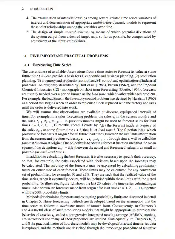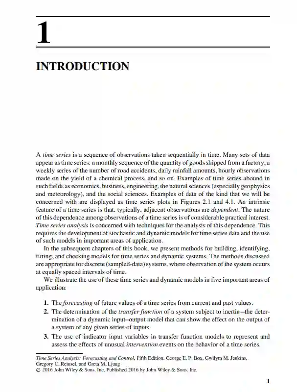 这本书描述了分析离散时间序列的统计模型和方法,并介绍了方法论的重要应用。所考虑的模型包括一类自回归综合移动平均(ARIMA)模型和这些模型的各种扩展。对模型的性质进行了检验,并提出了模型规范、参数估计和模型检验的统计方法。介绍了非季节性和季节性时间序列的预测方法。讨论了传递函数建模两个或多个时间序列之间的动态关系的方法的扩展,建模干预事件的影响,多元时间序列建模,和过程控制。主题,如状态空间和结构建模,非线性模型,长记忆模型,和条件异方差模型也被涵盖。目标一直是提供一个文本,是实用的和有价值的学术和实践者。