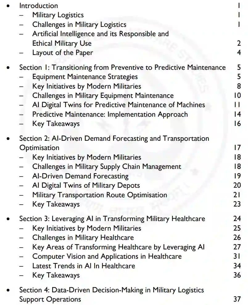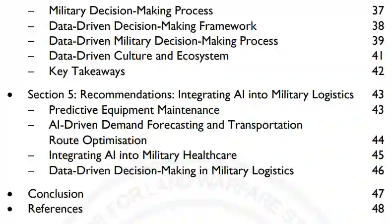 本文分为五个部分。每个部分都总结了在军事后勤相关子领域开展研究的收获。第 1 节讨论了印度陆军从预防性维护过渡到预测性维护的必要性。它强调了预测性维护在延长设备正常运行时间和降低维护成本方面的益处。第 2 节探讨了将人工智能纳入军事供应链管理的潜在好处,重点是需求预测和运输路线优化。第 3 节探讨了人工智能改造军事医疗系统的潜力,重点关注临床决策支持系统 (CDSS)、疾病诊断决策支持 (DDDS)、伤员分流、心理健康和自我保健。第 4 节强调了在印度陆军中建立数据驱动文化对改善军事后勤支持行动决策的意义。它强调了数据驱动决策(DDMM)的重要性,以及如何将其纳入军事决策过程(MDMP),以提高决策准确性、资源利用率和节约成本。最后,第 5 节包含了将人工智能融入军事物流若干子领域的关键建议,如预测性维护、需求预测、运输路线优化和医疗保健。它还就在印度陆军后勤保障行动中建立数据驱动决策的支持基础设施提出了建议。