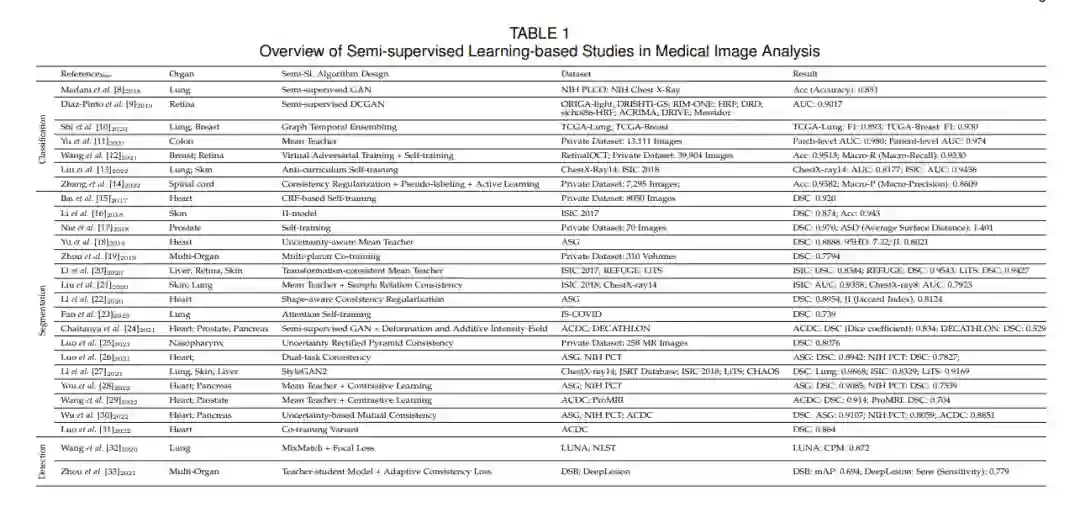 一个新兴的半监督学习研究方向是将上述类型的方法结合在一起并将其统一到一个整体框架中以获得更好的性能[12],[14],[32]。在本调研中,这些方法被称为混合方法。例如,Wang et al.[12]和Zhang et al.[14]将一致性正则化与自训练相结合来解决医学图像分类问题。此外,Mixup[61]作为一种有效的数据增强策略在混合方法中被频繁使用。在[62]中,作者在输入空间和潜空间上实现了Mixup,以基于已标记和未标记数据创建更多的样本标签对,以促进医学图像分类。Wang等人利用Mixup和focal loss改进了将一致性正则化和伪标记相结合的MixMatch[63],用于3D医学图像检测领域。通过利用多种半监督方法,该模型能够学习底层不变特征,同时具有较强的预测能力 **